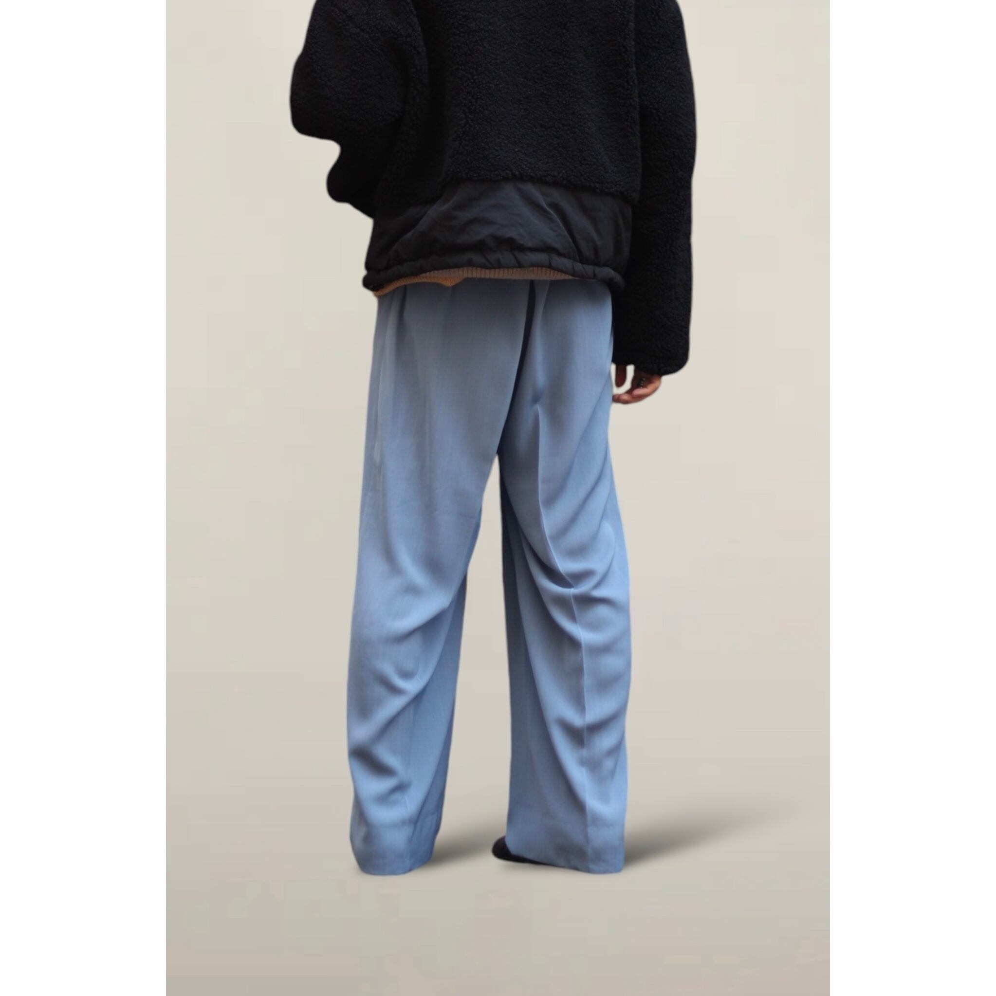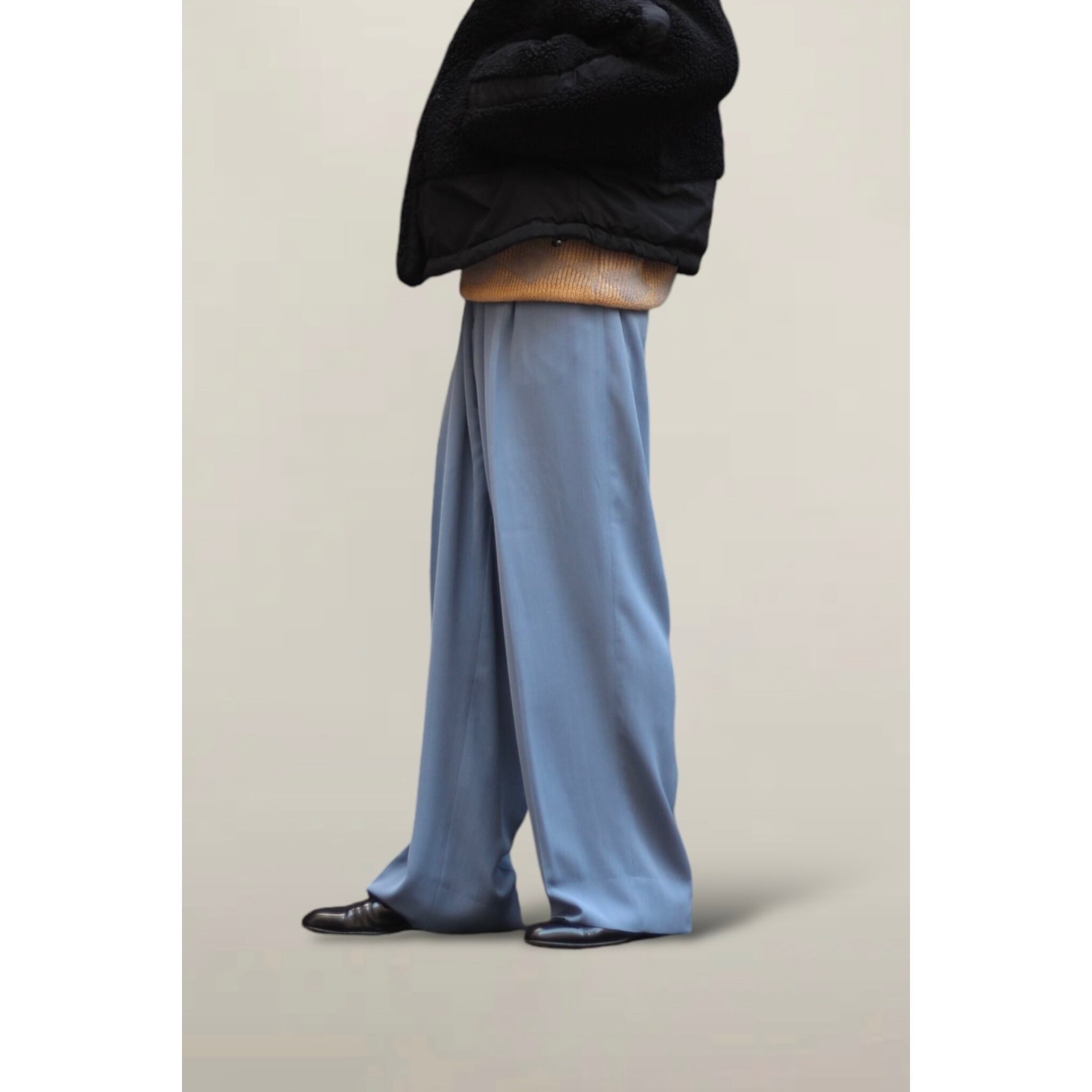 スモークブルーのアンニュイな雰囲気が色っぽいですね。スラックスだと中々ない色味でもあります。