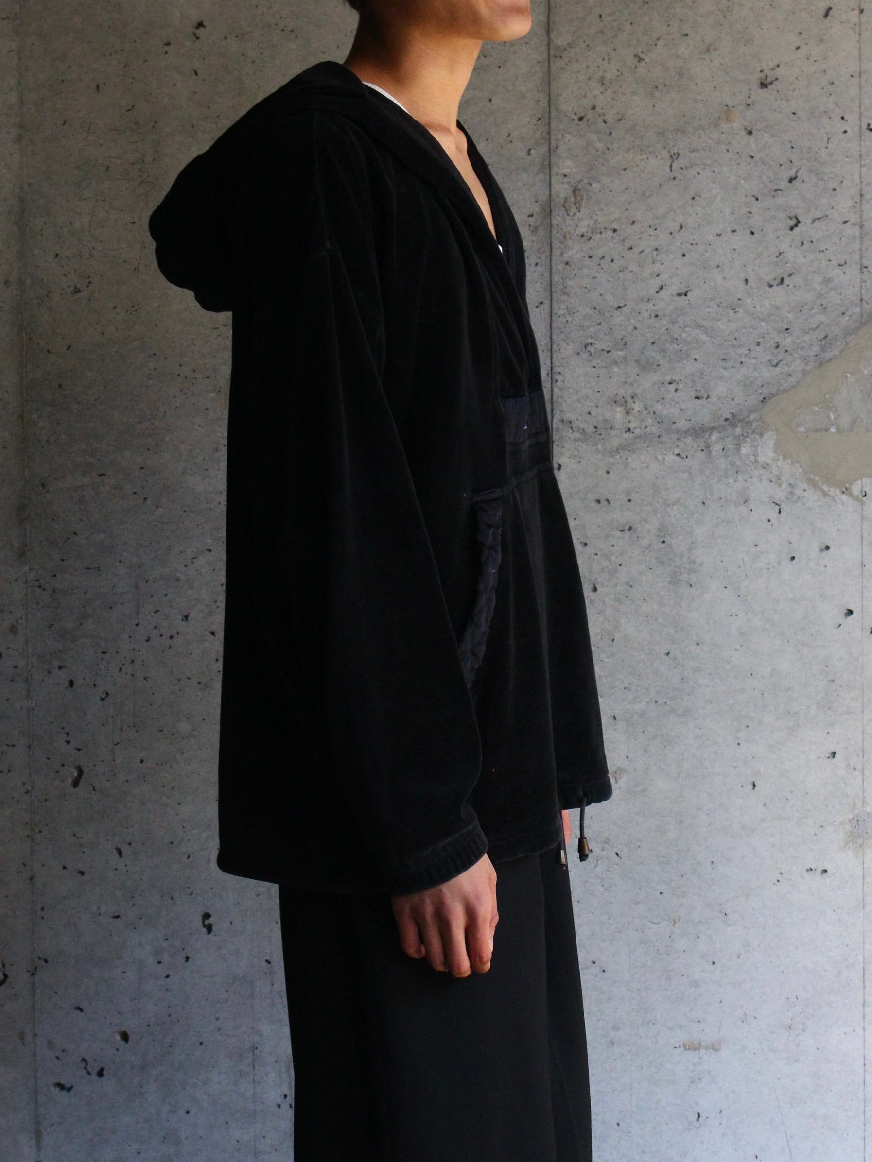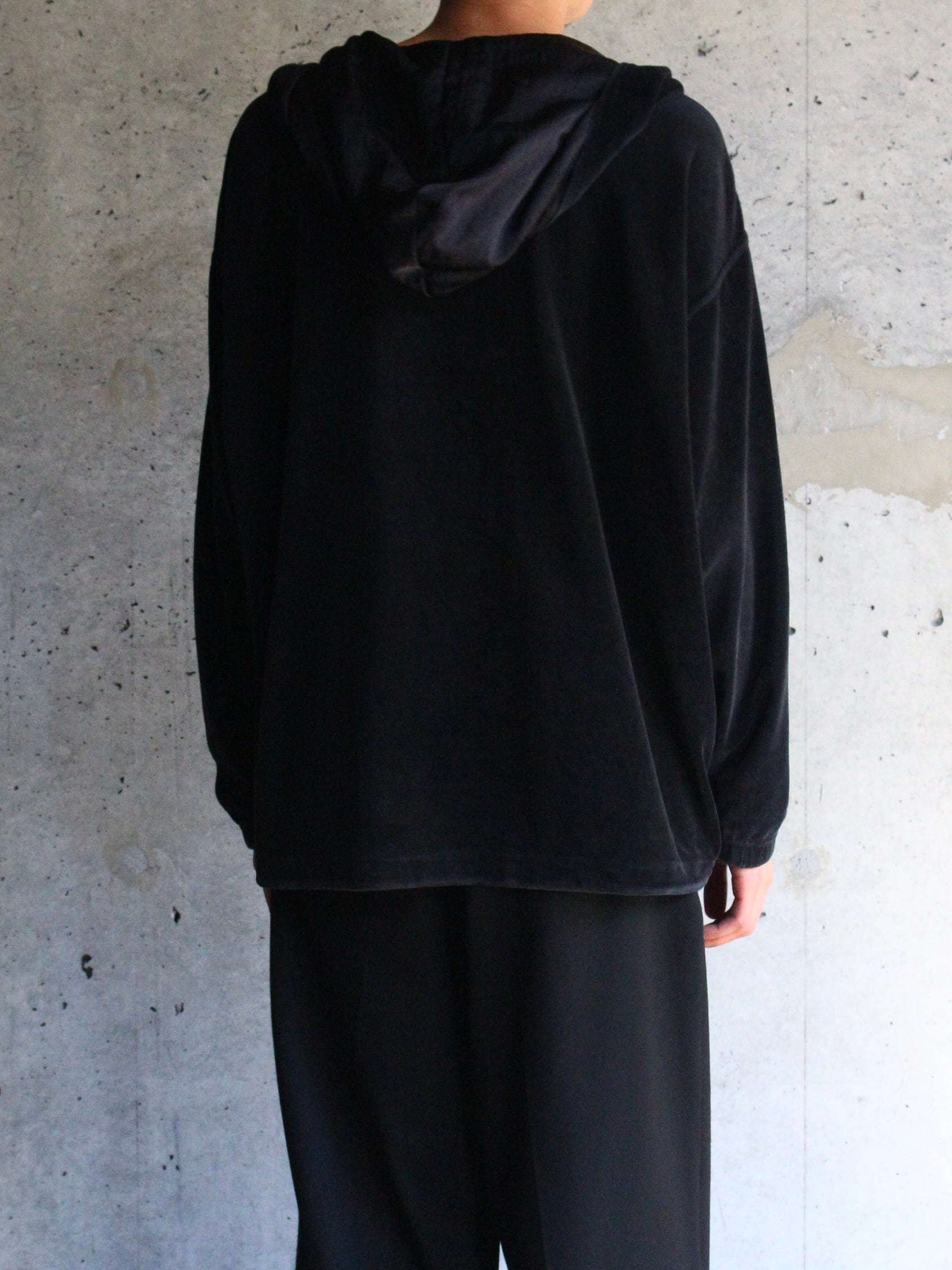 こちらは光沢感が素晴らしいフーディになっており高級感漂うベロアファブリックに収納力が高いカンガルーポケット仕様。
