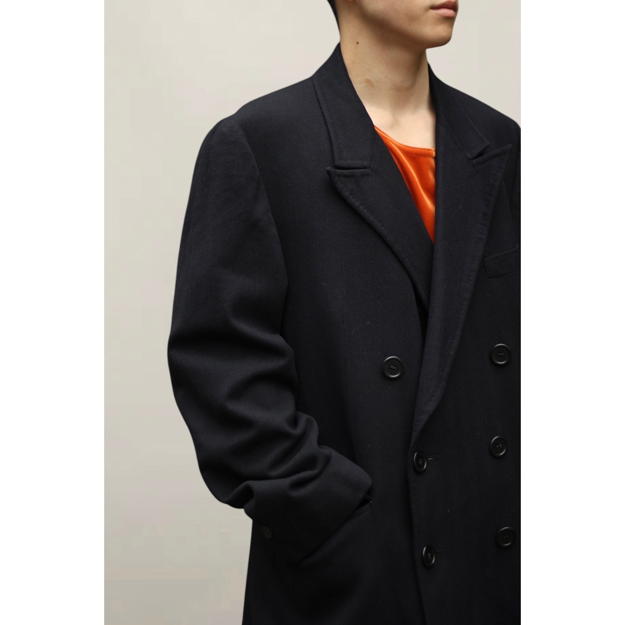 ダブルの合わせでシンプル且つ品のあるシルエットが非常に合わせやすく、カジュアルからフォーマルまで使い勝手が良い逸品。