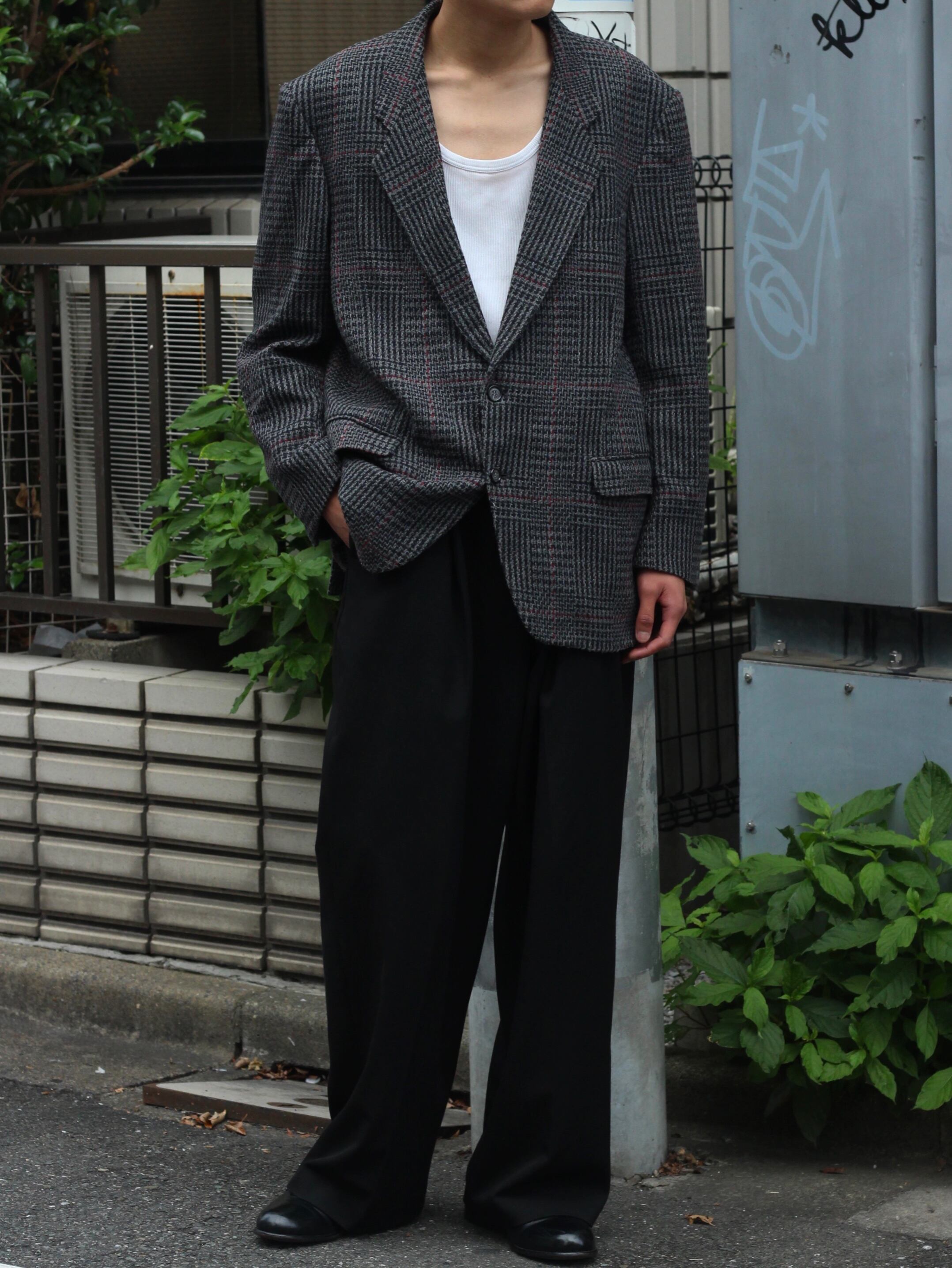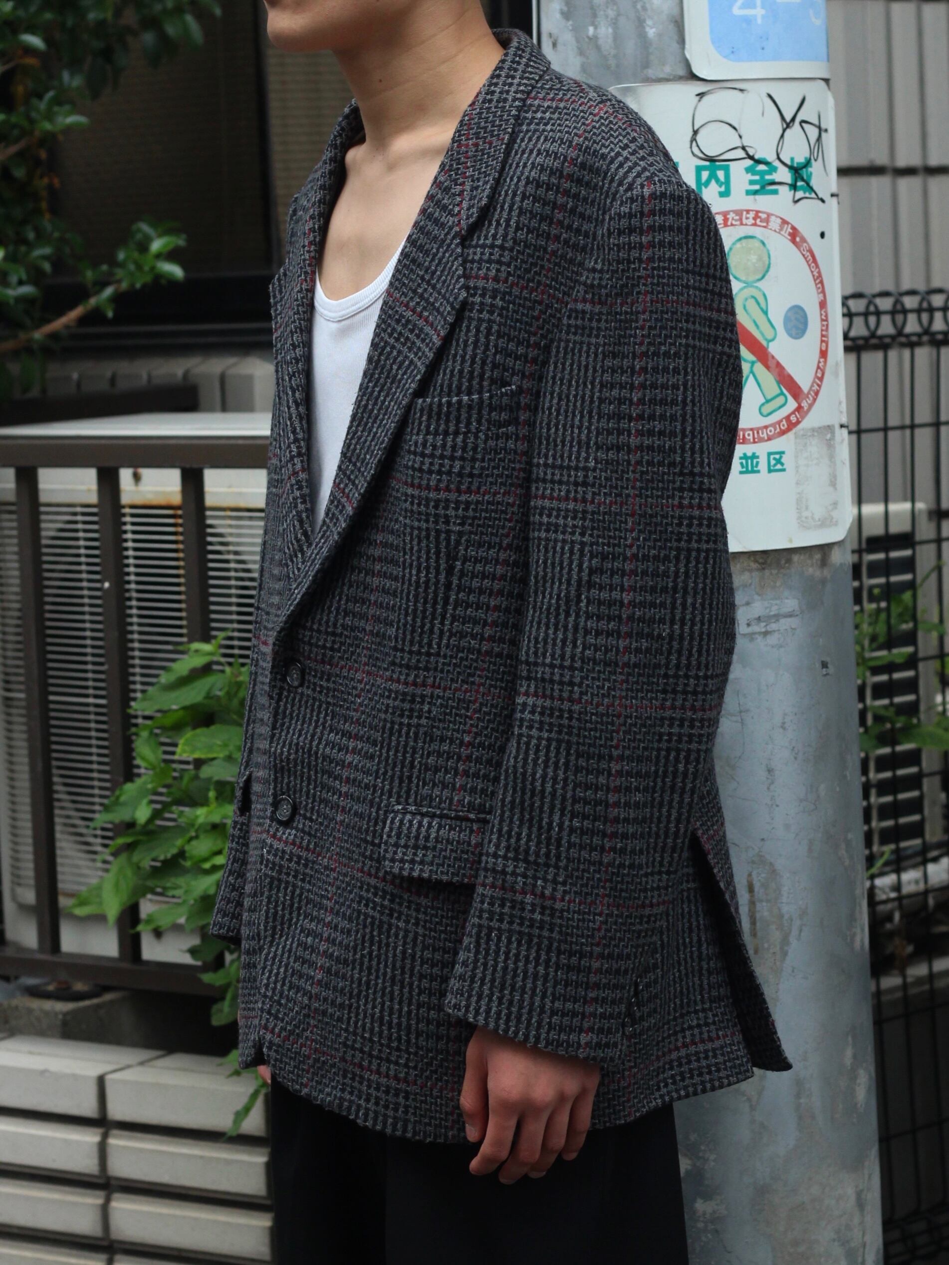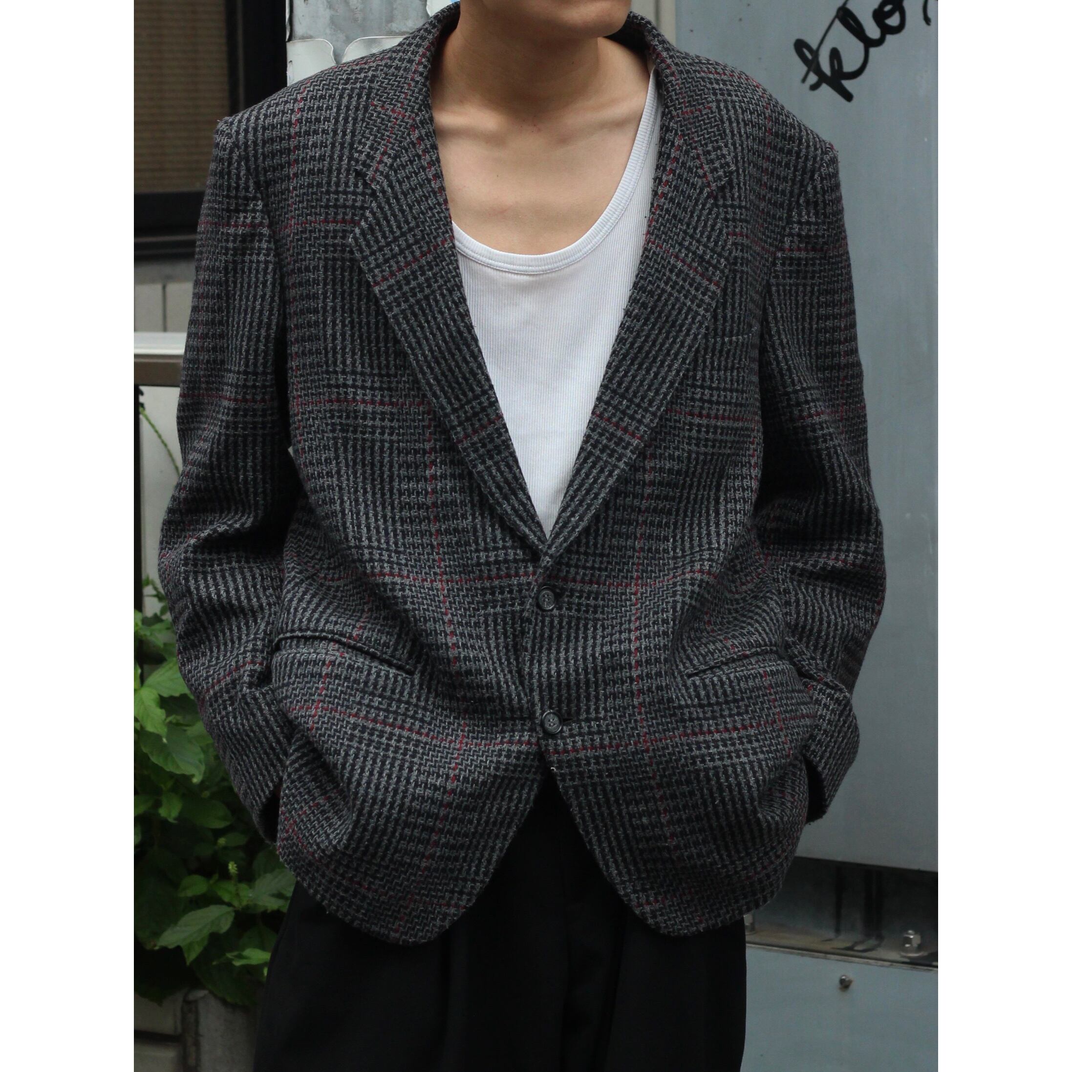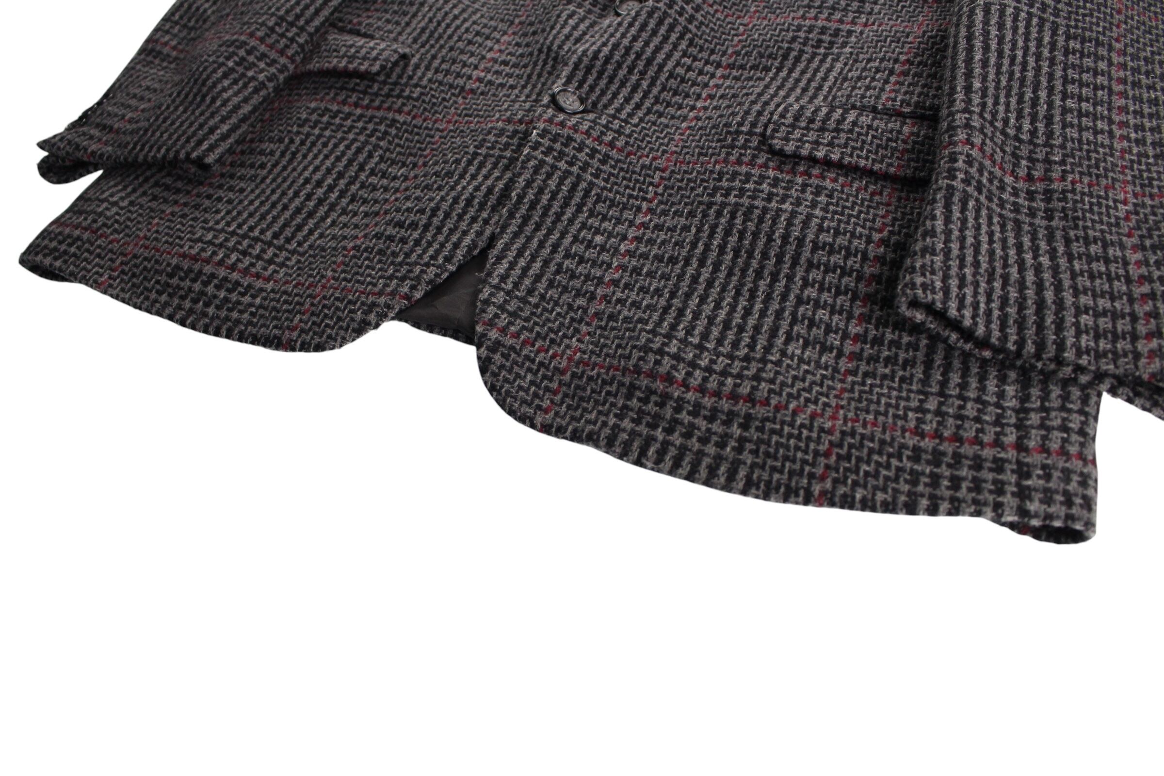 カラーはグレー×ブラックに時折入るレッドラインが◎ヘリンボーン調のような幾何学模様でブランドテーラードでは珍しい柄感。