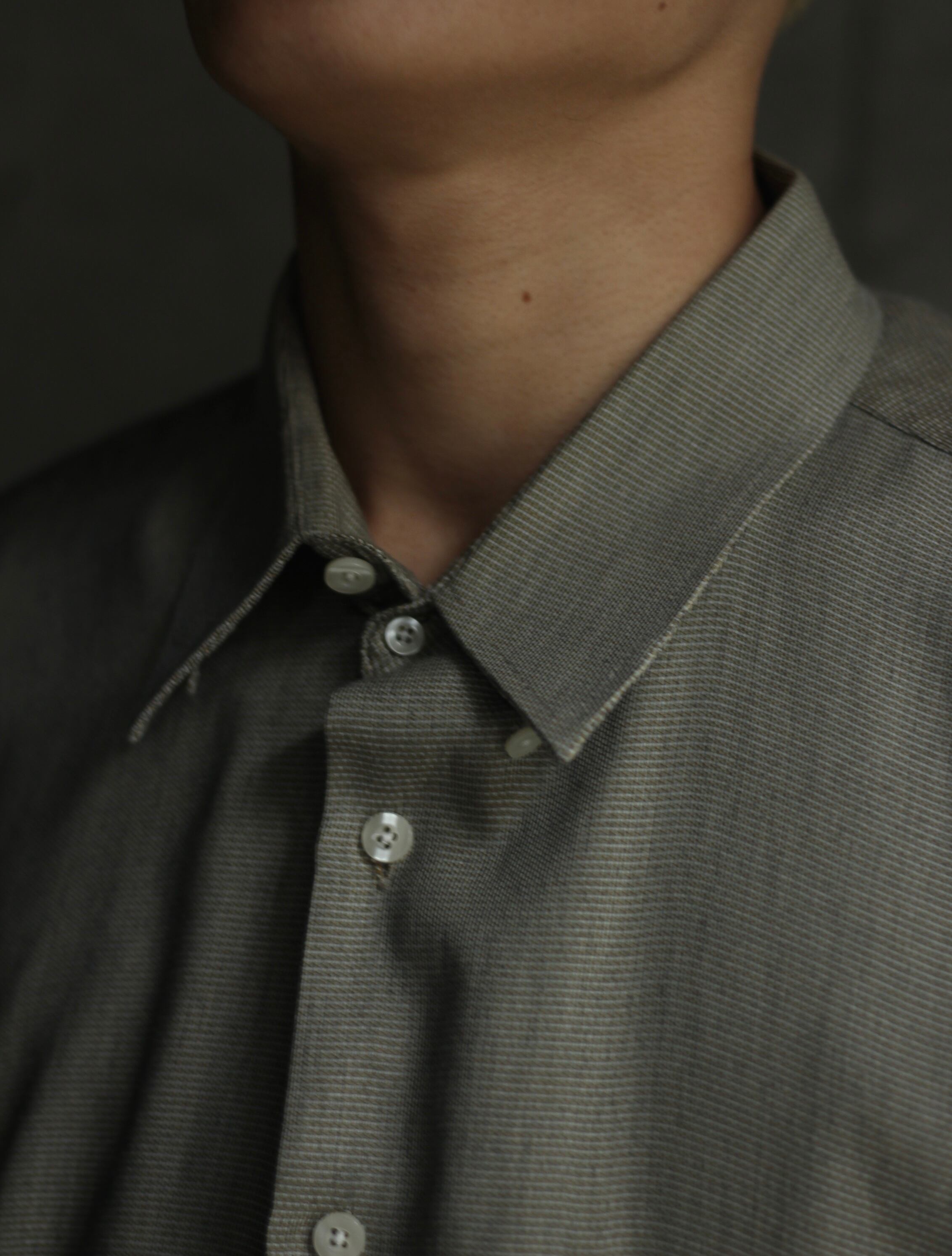 遠くからだとドットのような細かいチェック柄でほぼ無地に近いブランドらしい上品なシャツ。通常のボタンダウンシャツはボタンが襟を貫通して取り付けられていますが,こちらは襟裏に隠されているドレス仕様。ブランドらしい気遣いが◎