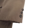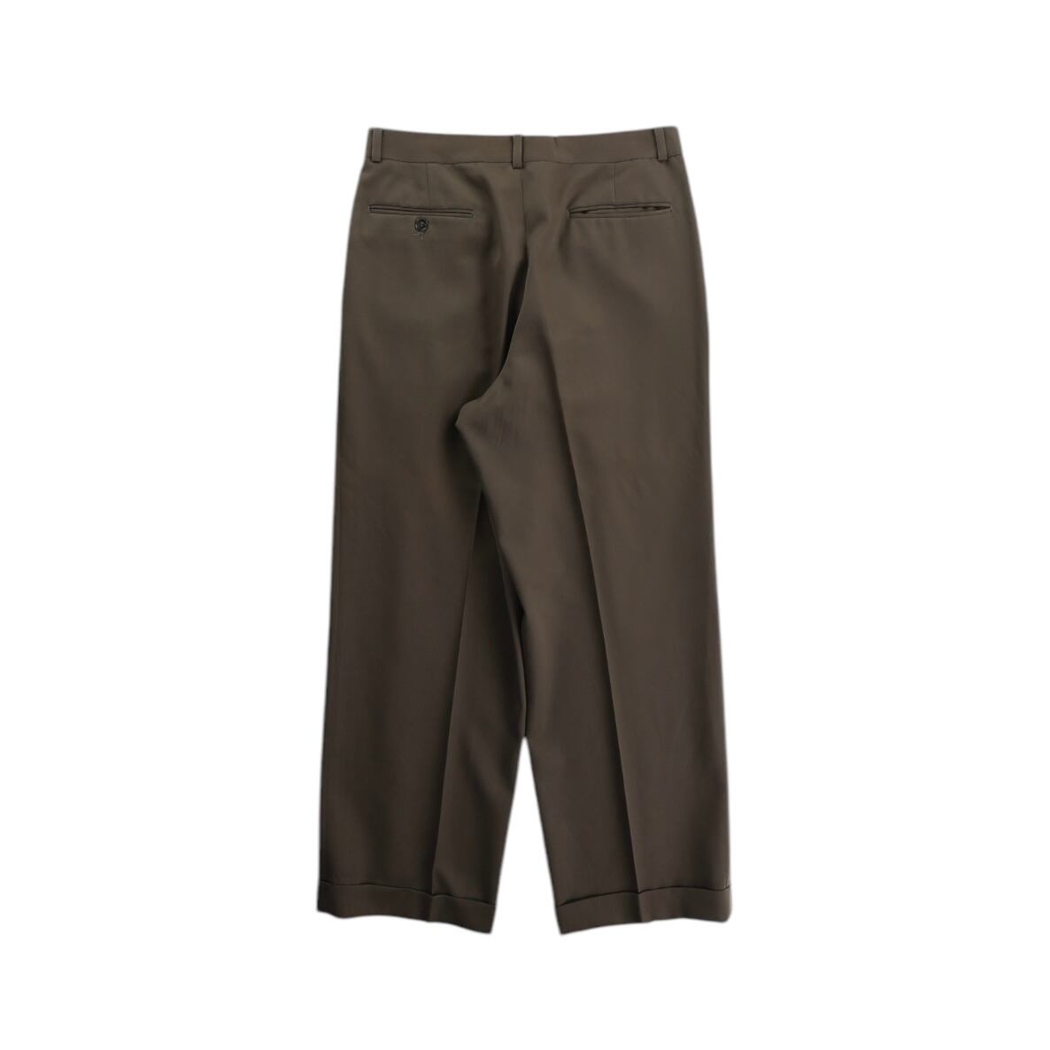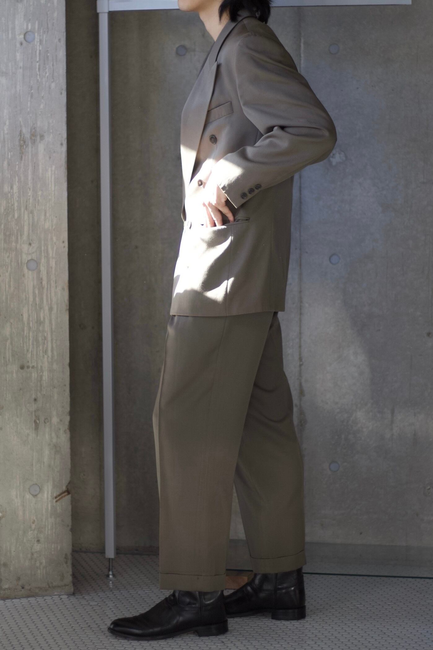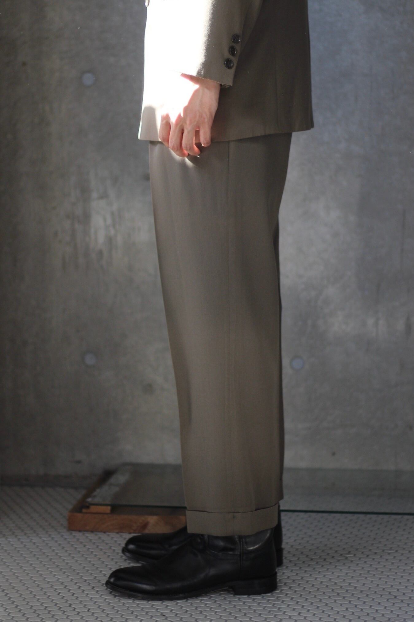 この時期っぽさがあるベージュカラーにジャケットはダブル仕様、スラックスはなんと、3タック仕様のテーパードスラックス。