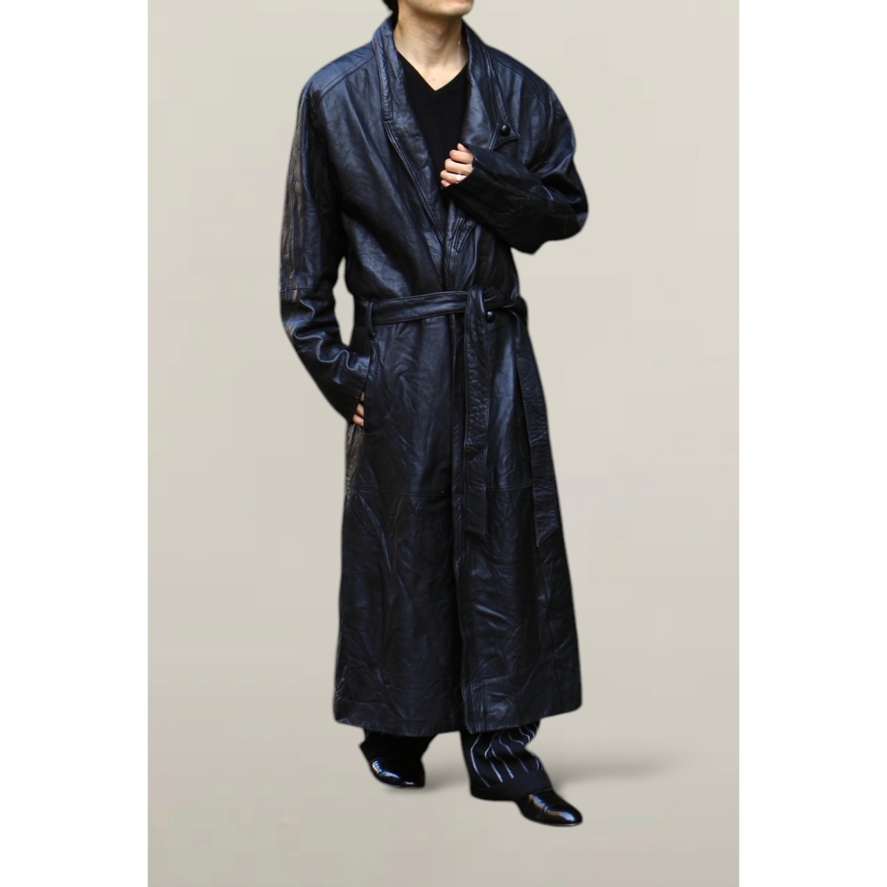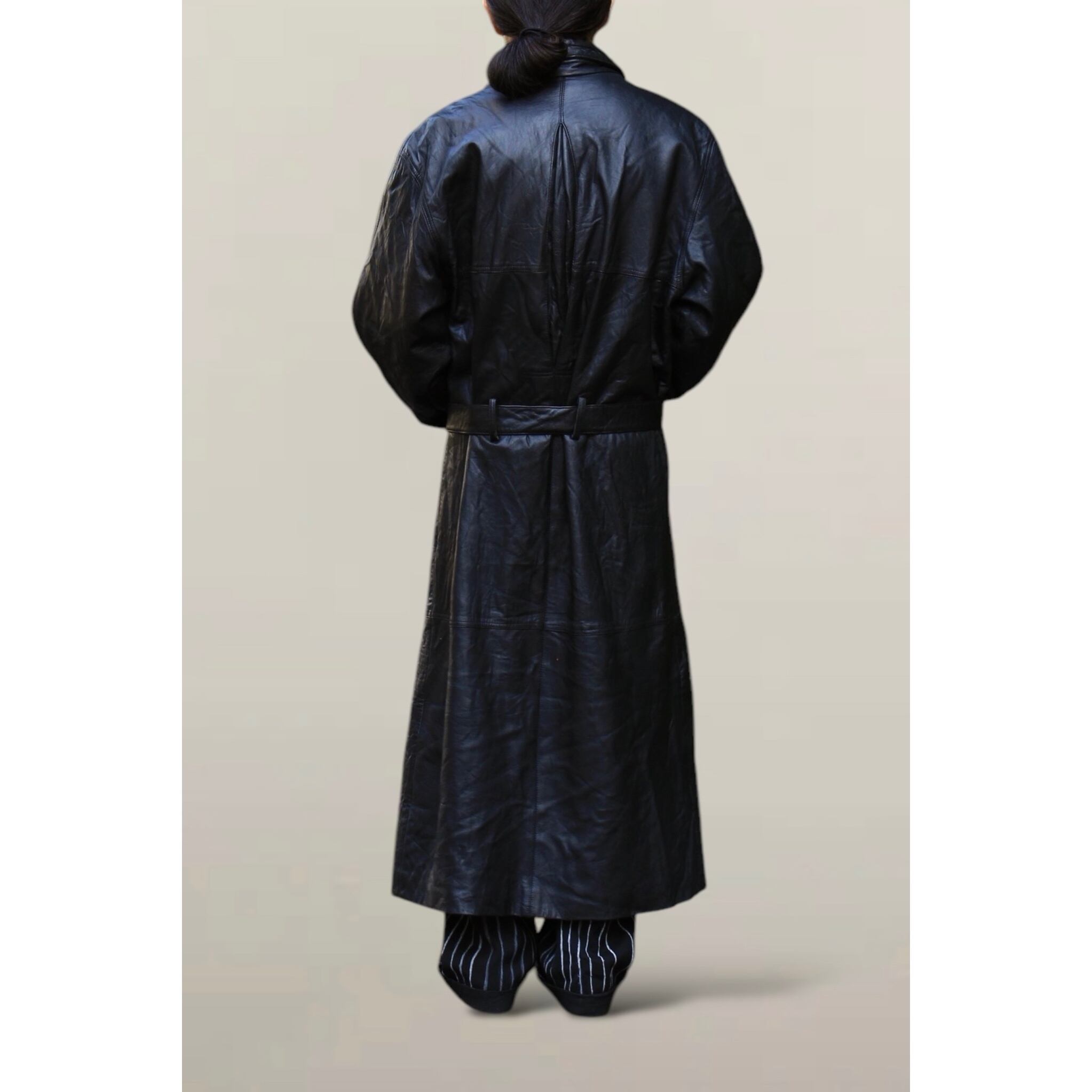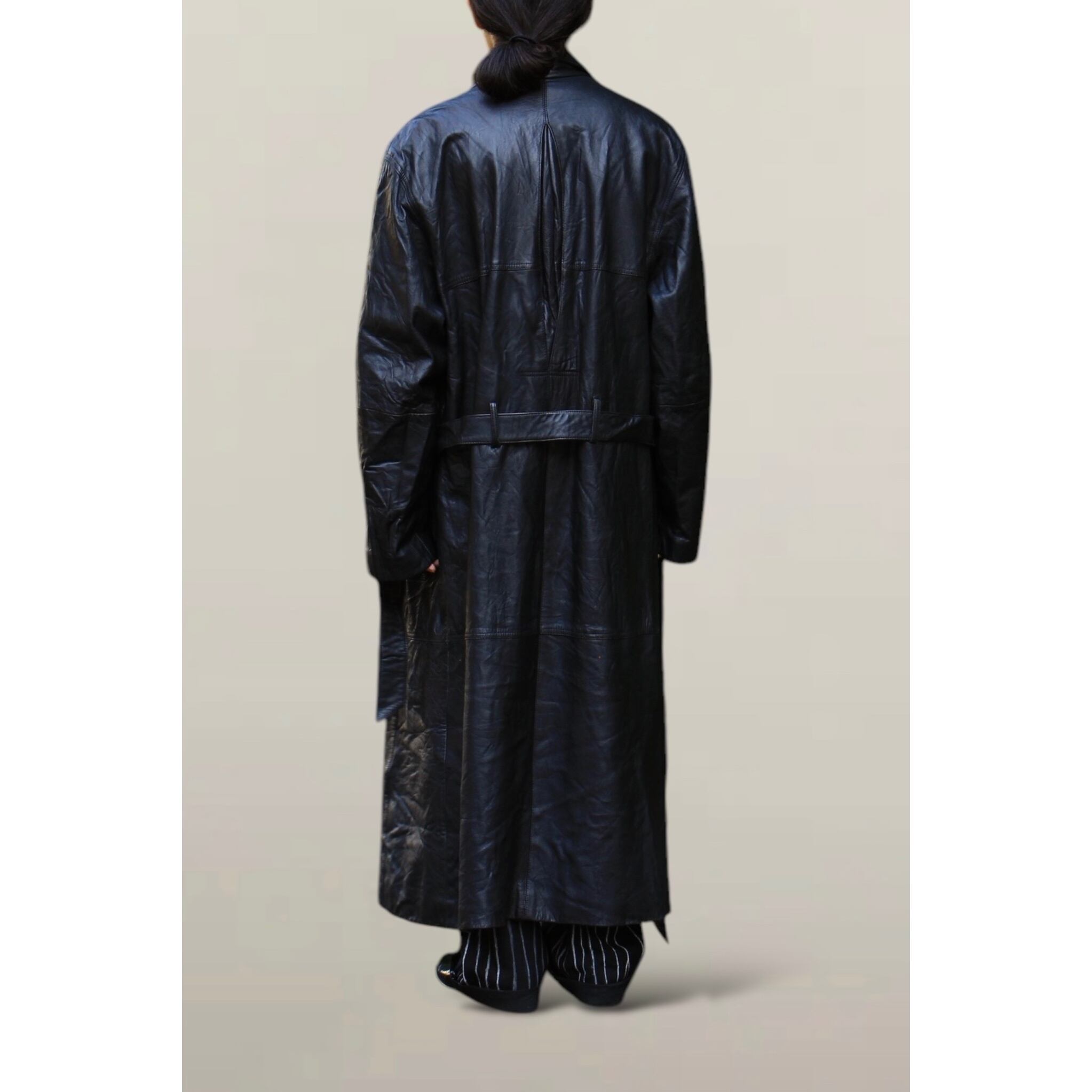 こちらは身幅広めの素晴らしいロングコート。ラムレザー使用なので生地も滑らかに落ちるような質感が堪らず、、最高でございます☺︎