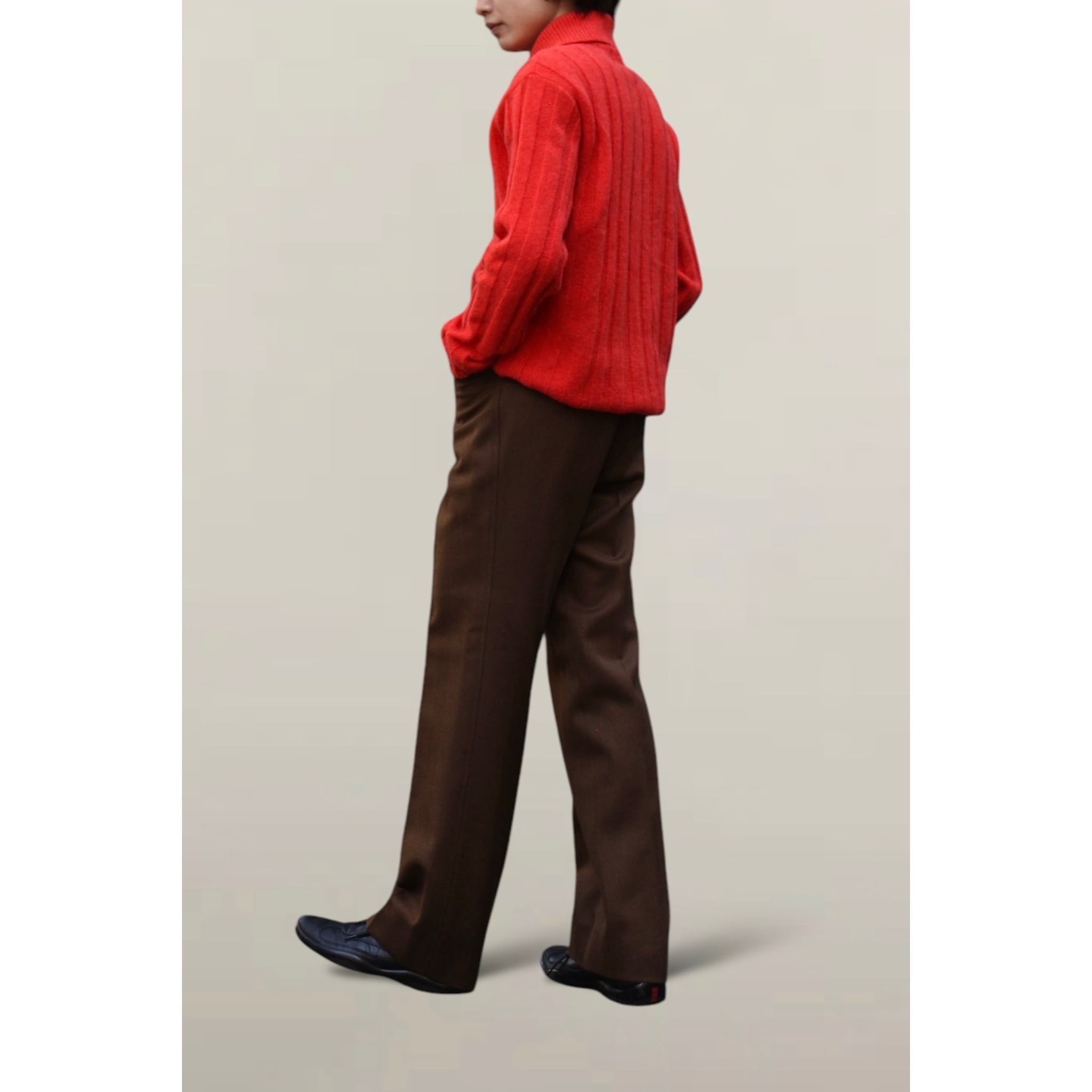 この時期は無性に履きたくなる茶色のパンツ。色物のトップスとの相性が良くスタイリングの要になる一本。