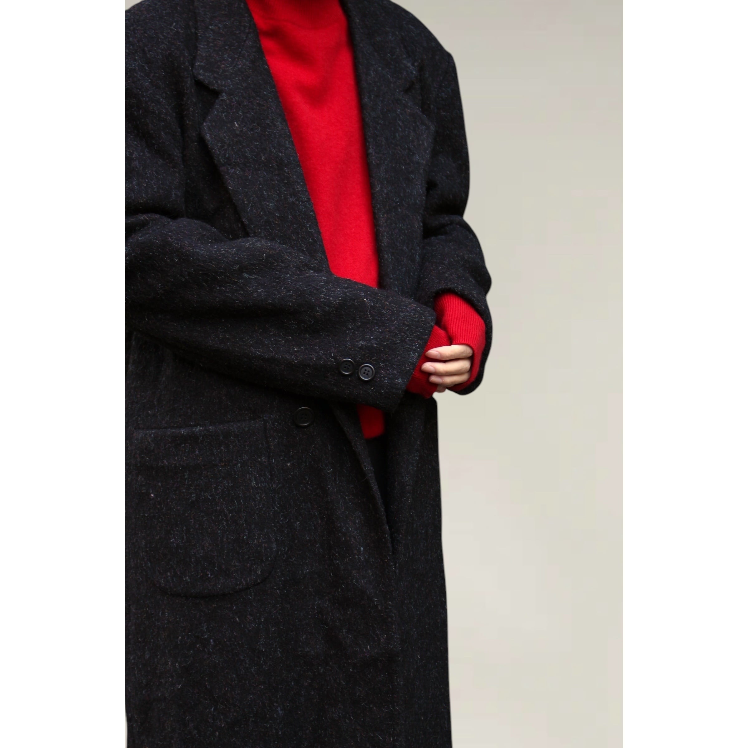 墨黒の使い勝手の良いカラーリングなので真冬は主役のアウターとして使っていただけるコート。