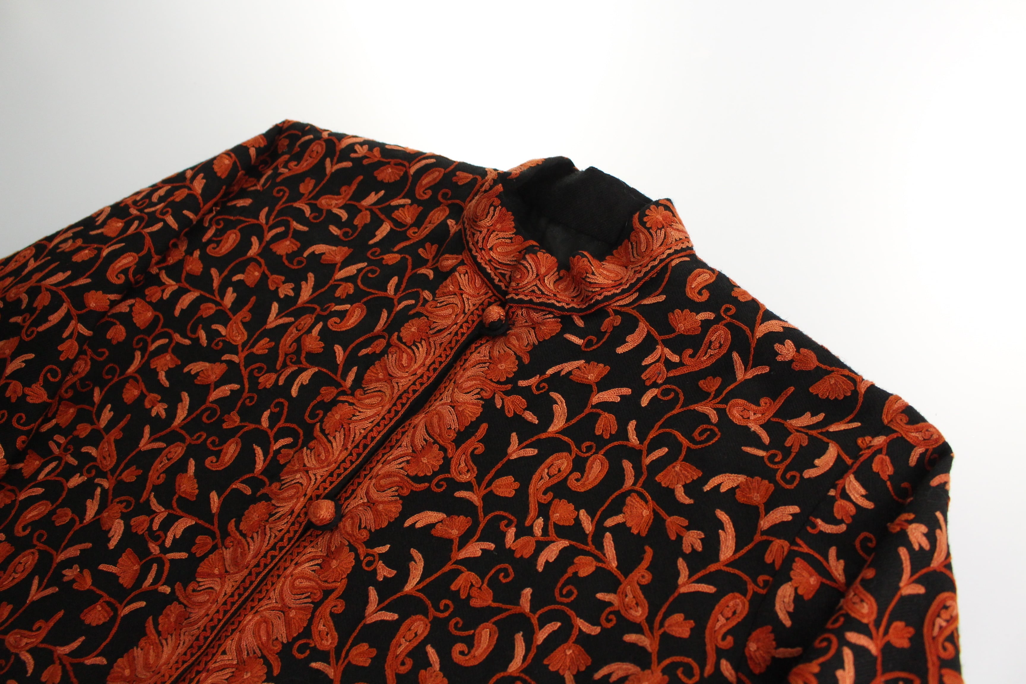 レッド、オレンジの糸でペイズリーのような柄刺繍がとても良いです〜