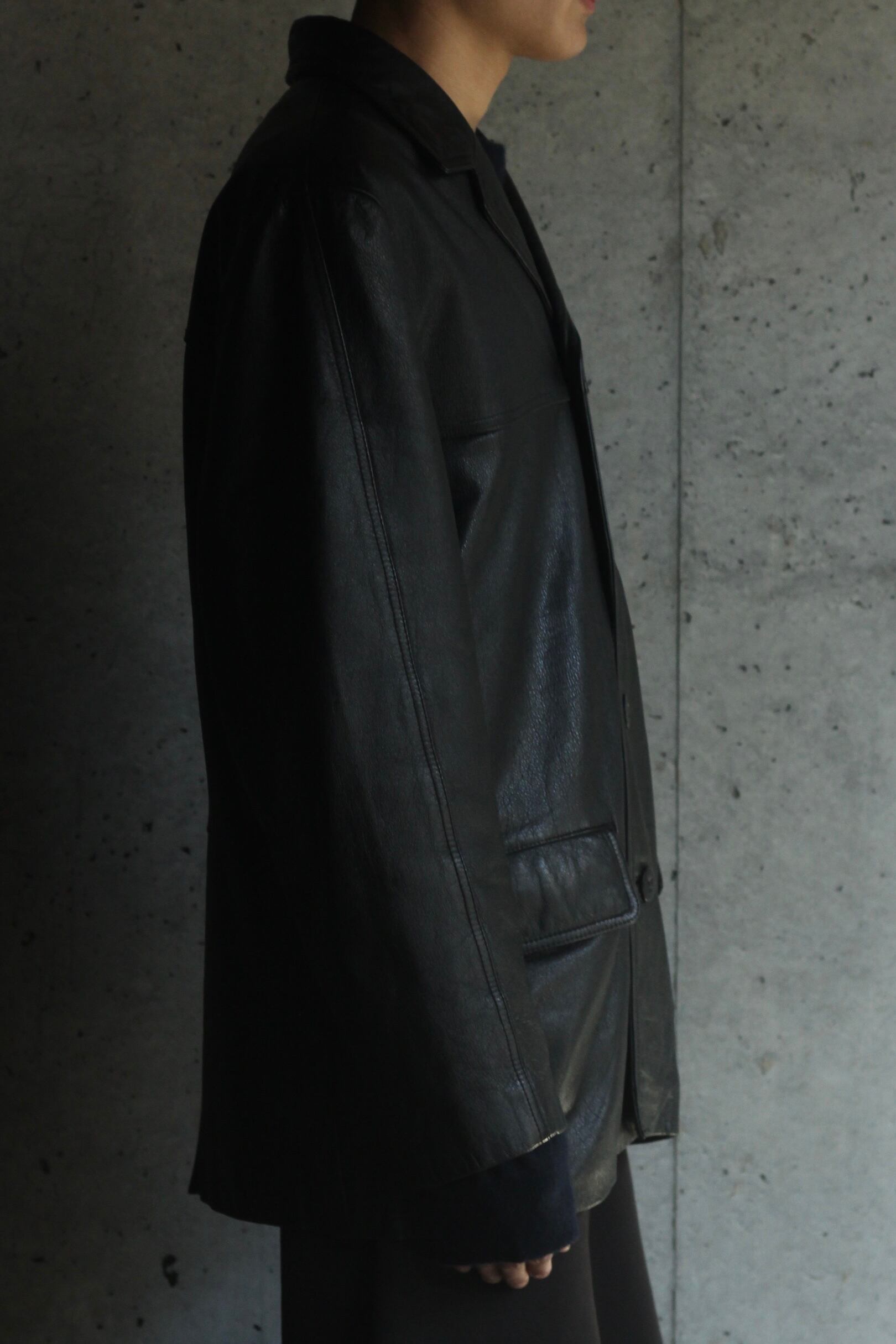 短丈ムードな中あえてこちらのミドルレングスは今に刺さるのかなと。男らしさと上品な面持ちの両立されたレザーカーコート。