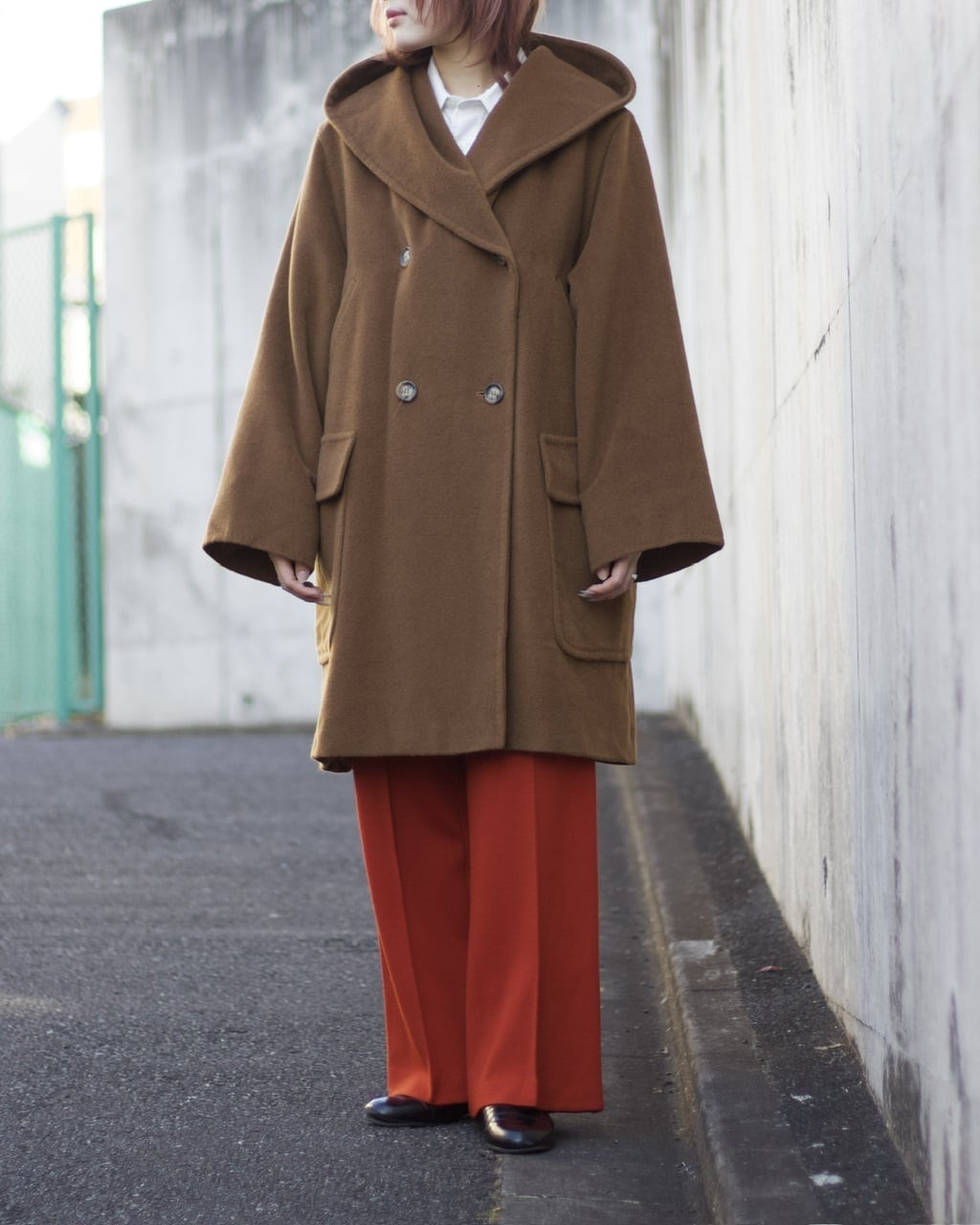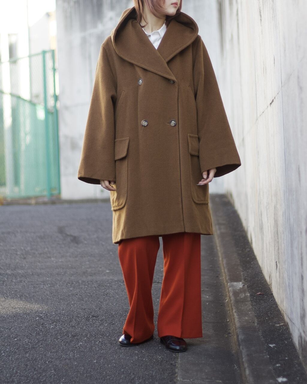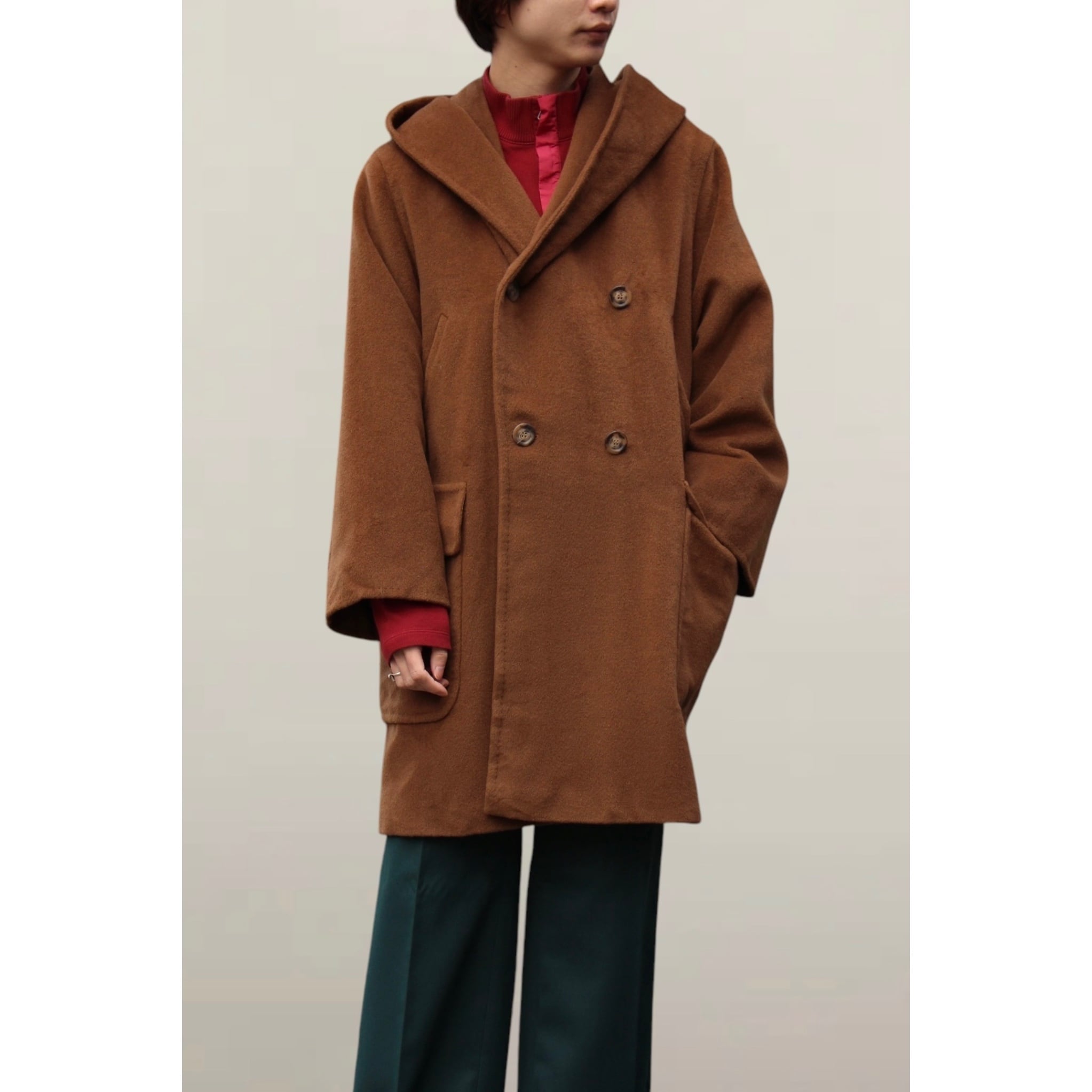 形も通常のコートと違い差別化が計れる1着。大きいフードにダブルの前開きがとても可愛い◎