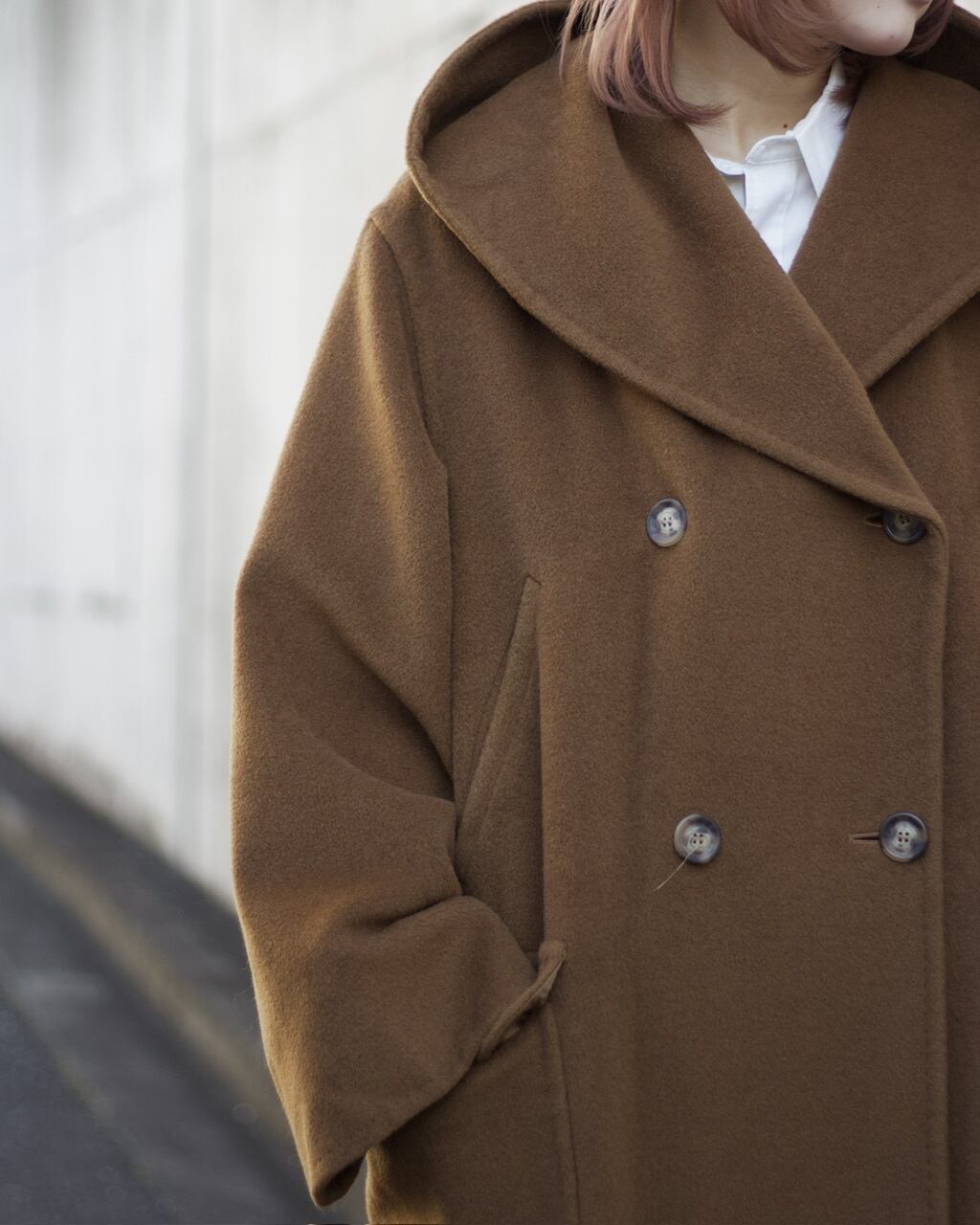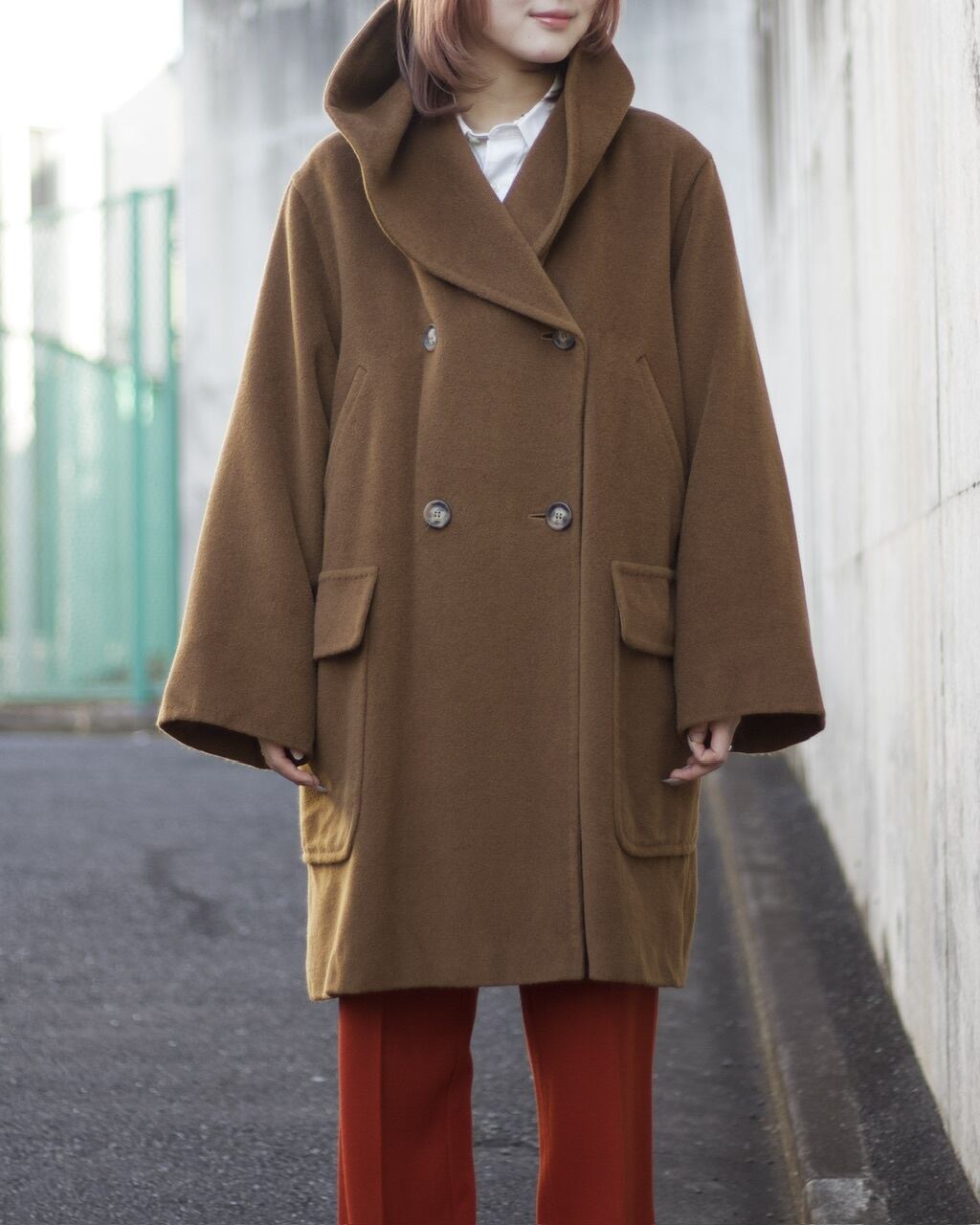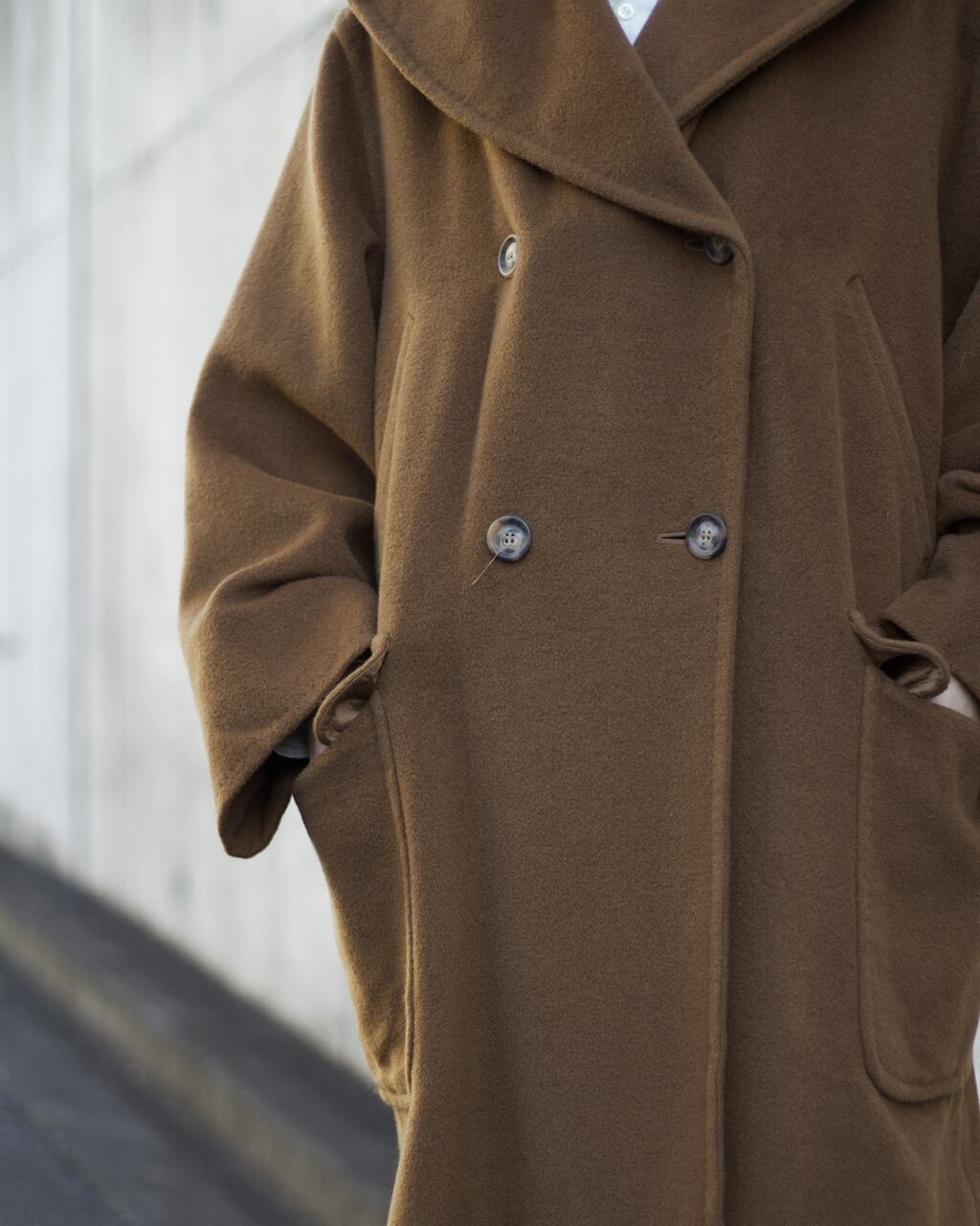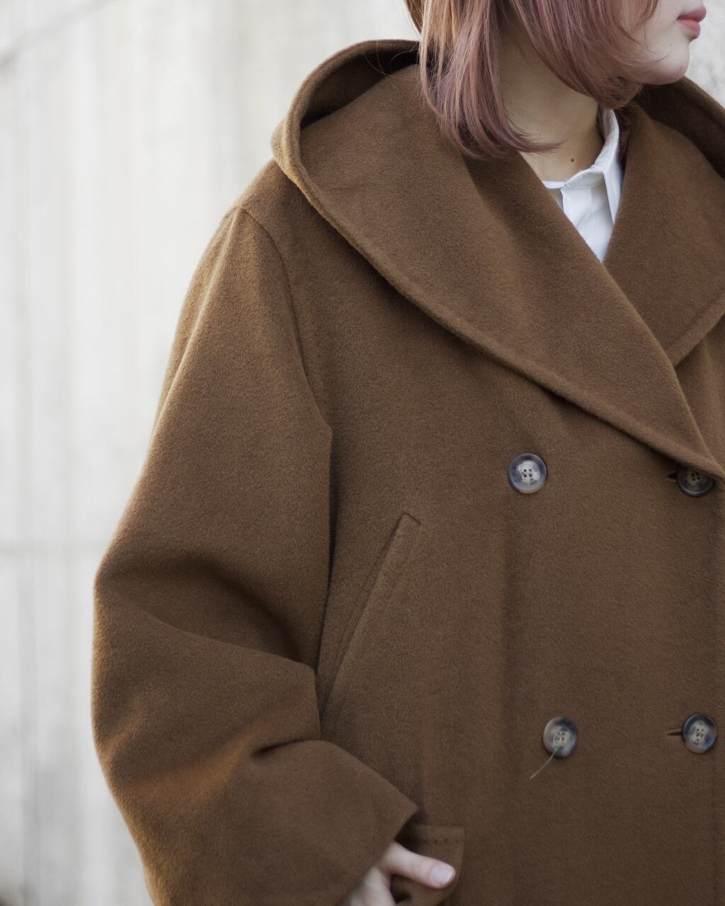 ファブリックはふわっと滑らかなカシミヤ混紡生地。着心地も柔らかく保温性の高いコートです☺︎重くなりがちなコートですがこちらは軽さも魅力的ですね〜