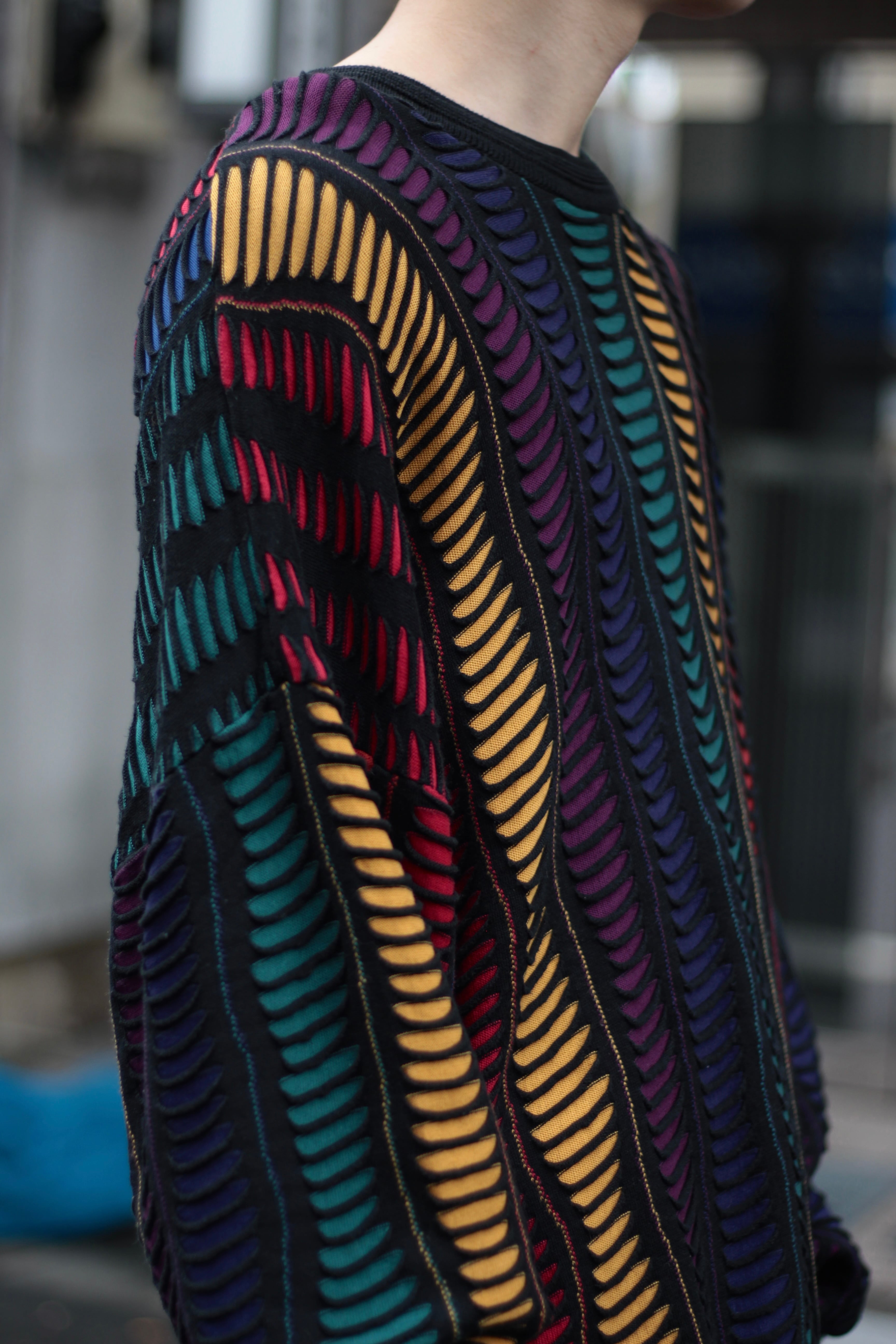 古着ならではのデザイン性、サイズバランスがおすすめなニット。3Dニットの中でも珍しいパターンではないでしょうか。