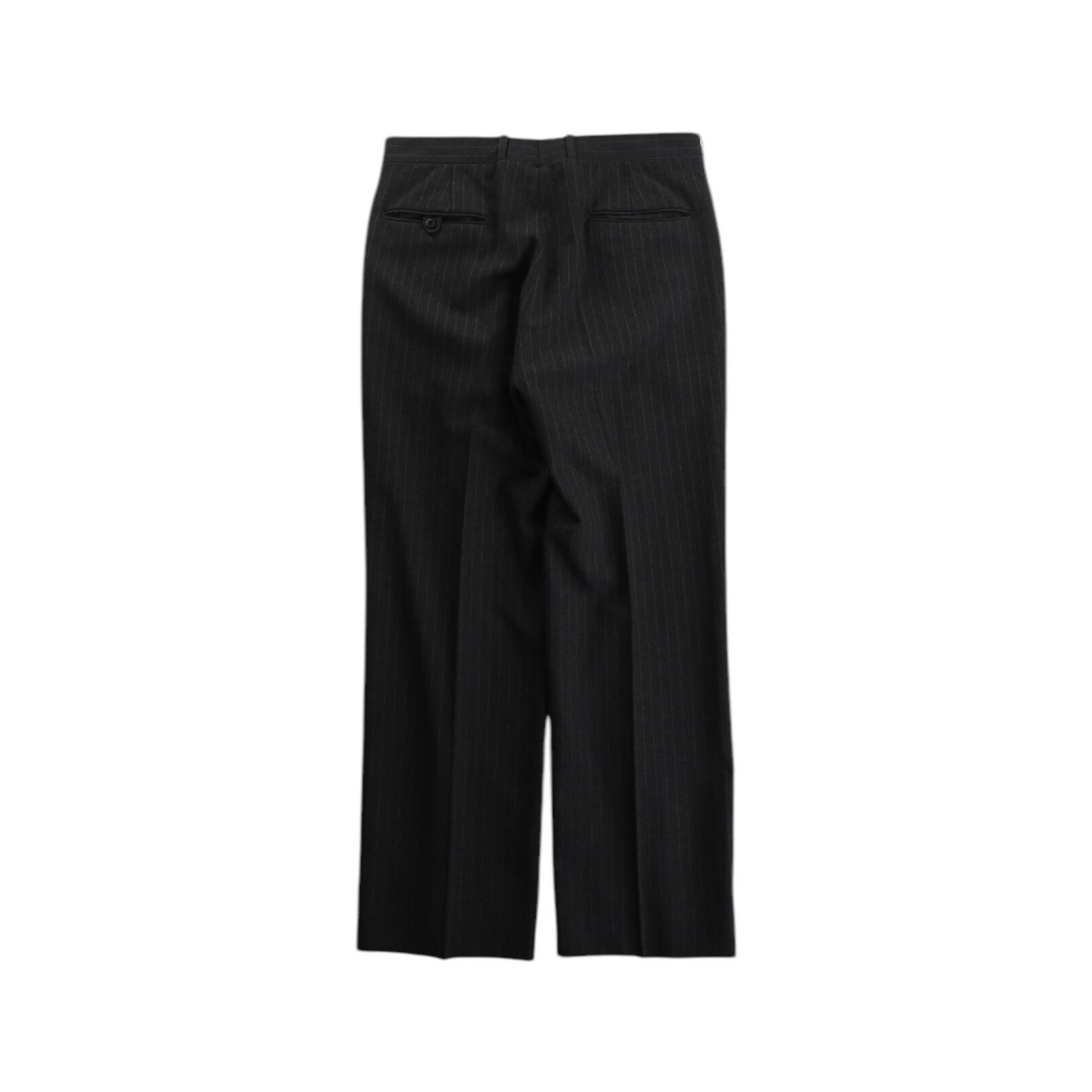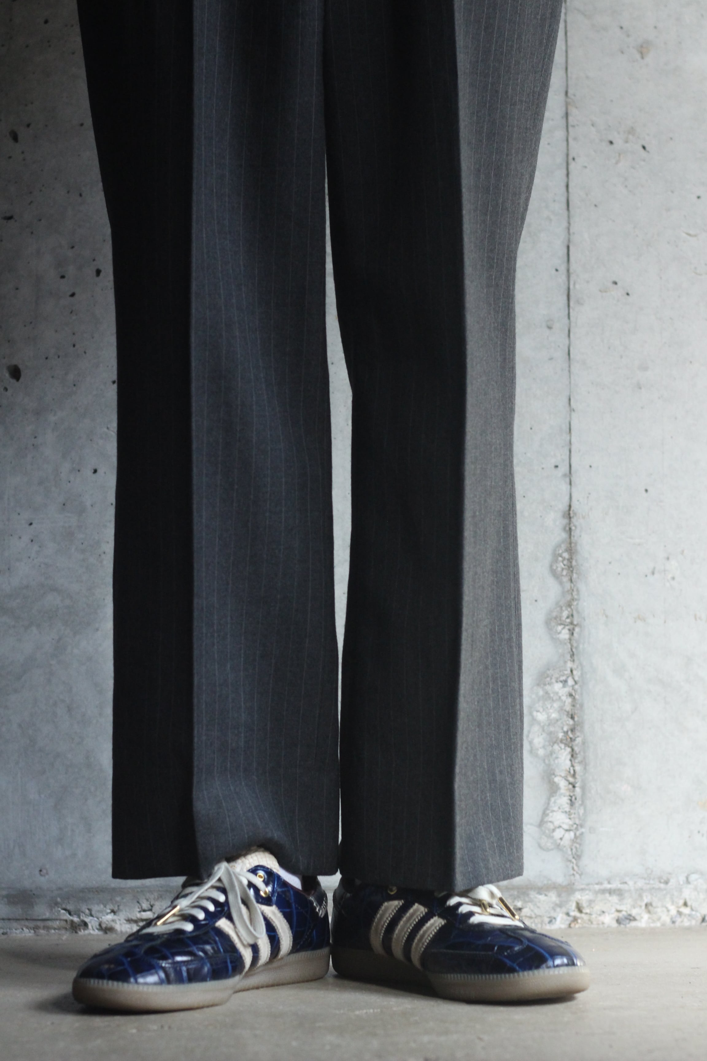 ボトムスも同様ピンストライプ仕様で2タックで腿あたりからゆとりがありストンと落ちる飽きの来ない綺麗なストレートシルエット。