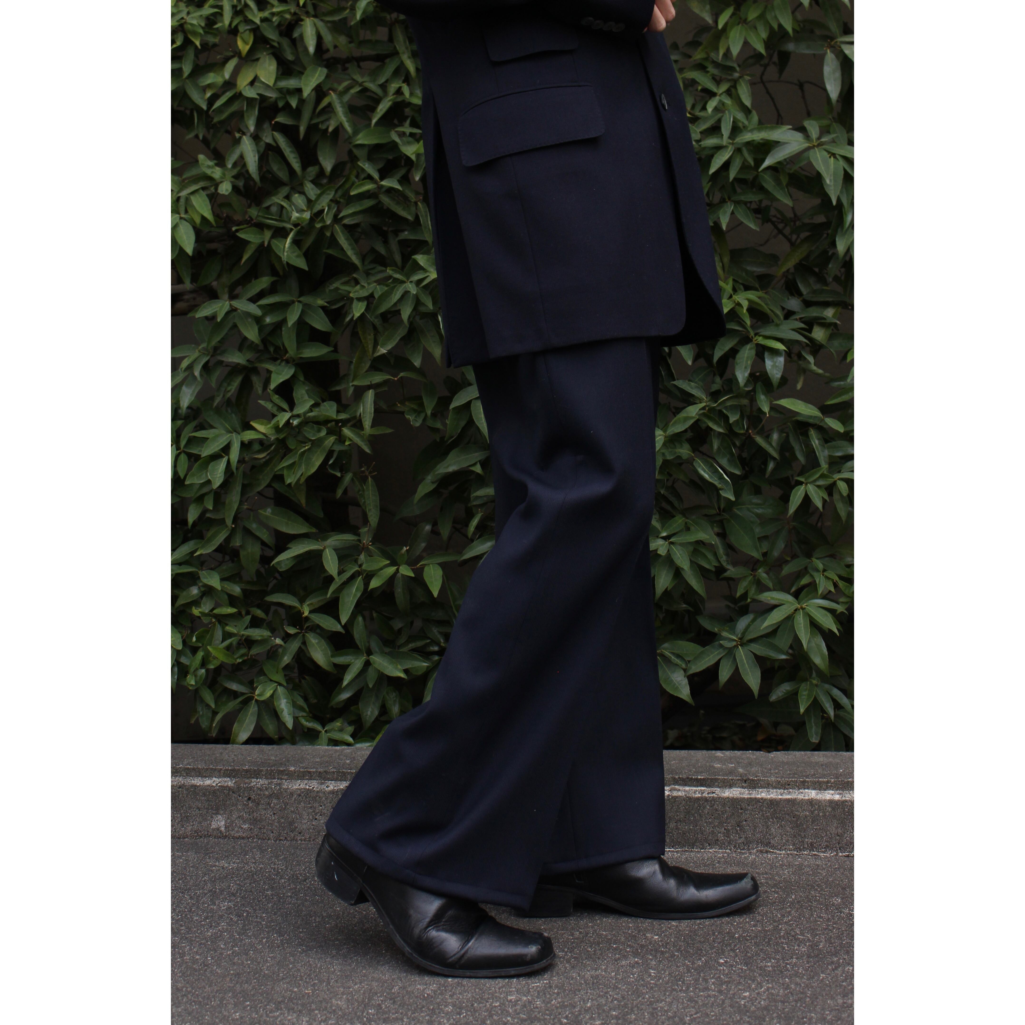 全身を通して、大人なネイビーカラーで身を包み、最後は洗練された美しいバギーフレアシルエットへと流れつき完結する。