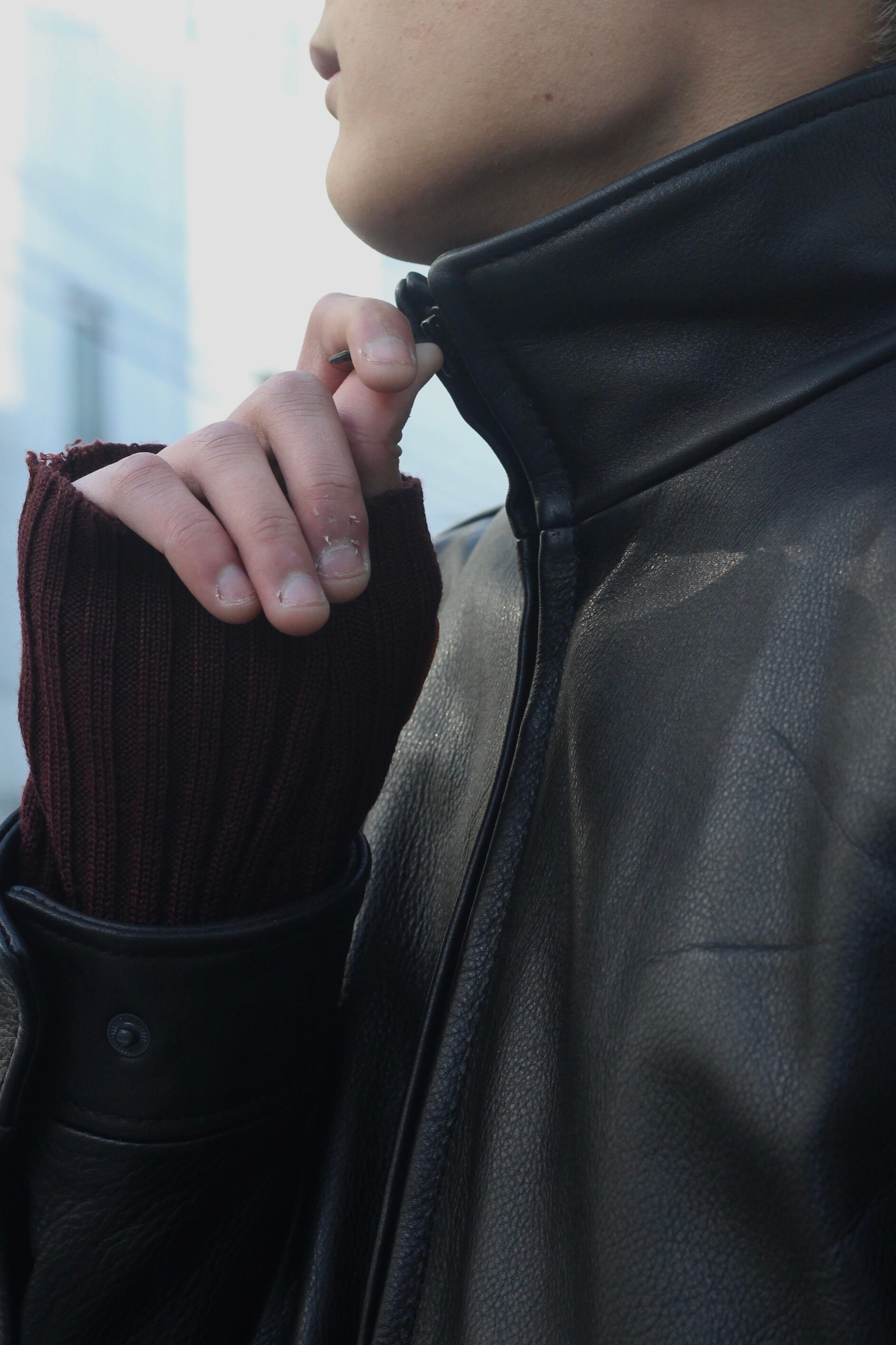 こちらはかなり洗練されたレザーブルゾンでまずマフラーいらずのハイネック仕様でジップを開けて襟付きブルゾンにしても最高!