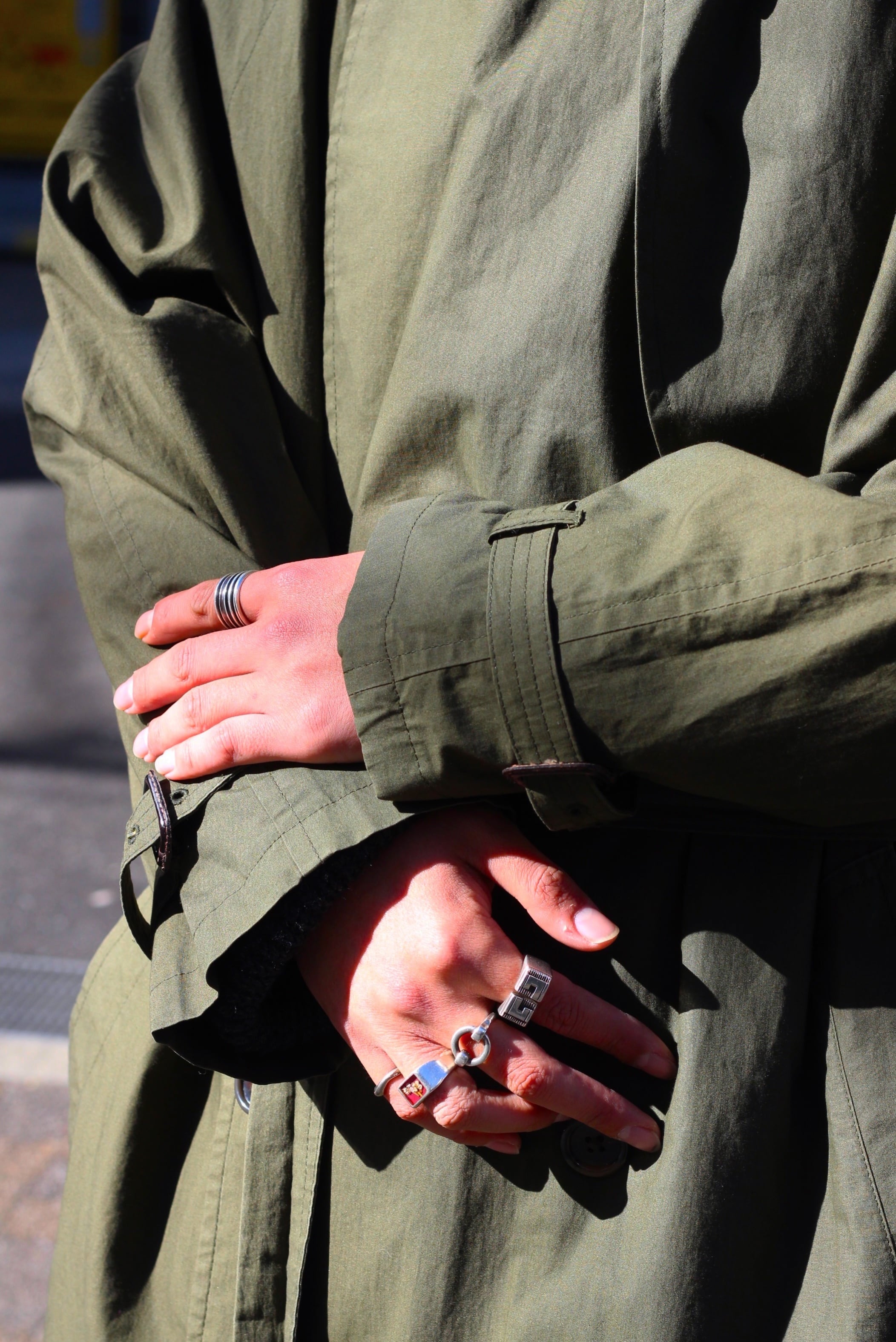 コートの形はクラシカルな印象を与えるトレンチのダブル。