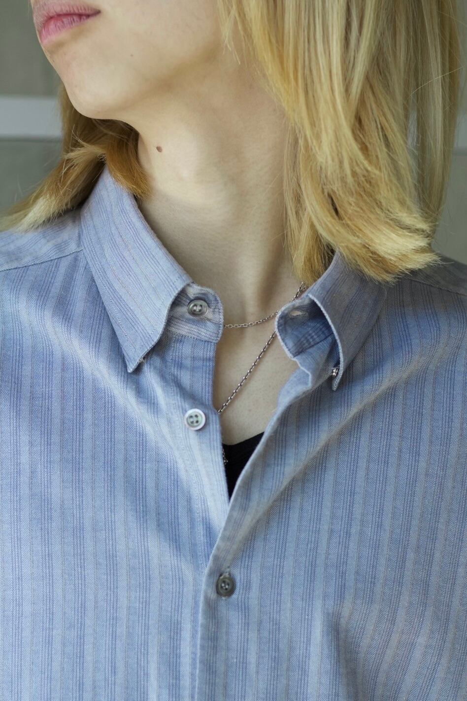 春夏を感じるクールなブルーベースの色味で仕立てられておりコンディションもグッドで非の打ち所がないドレスシャツ。