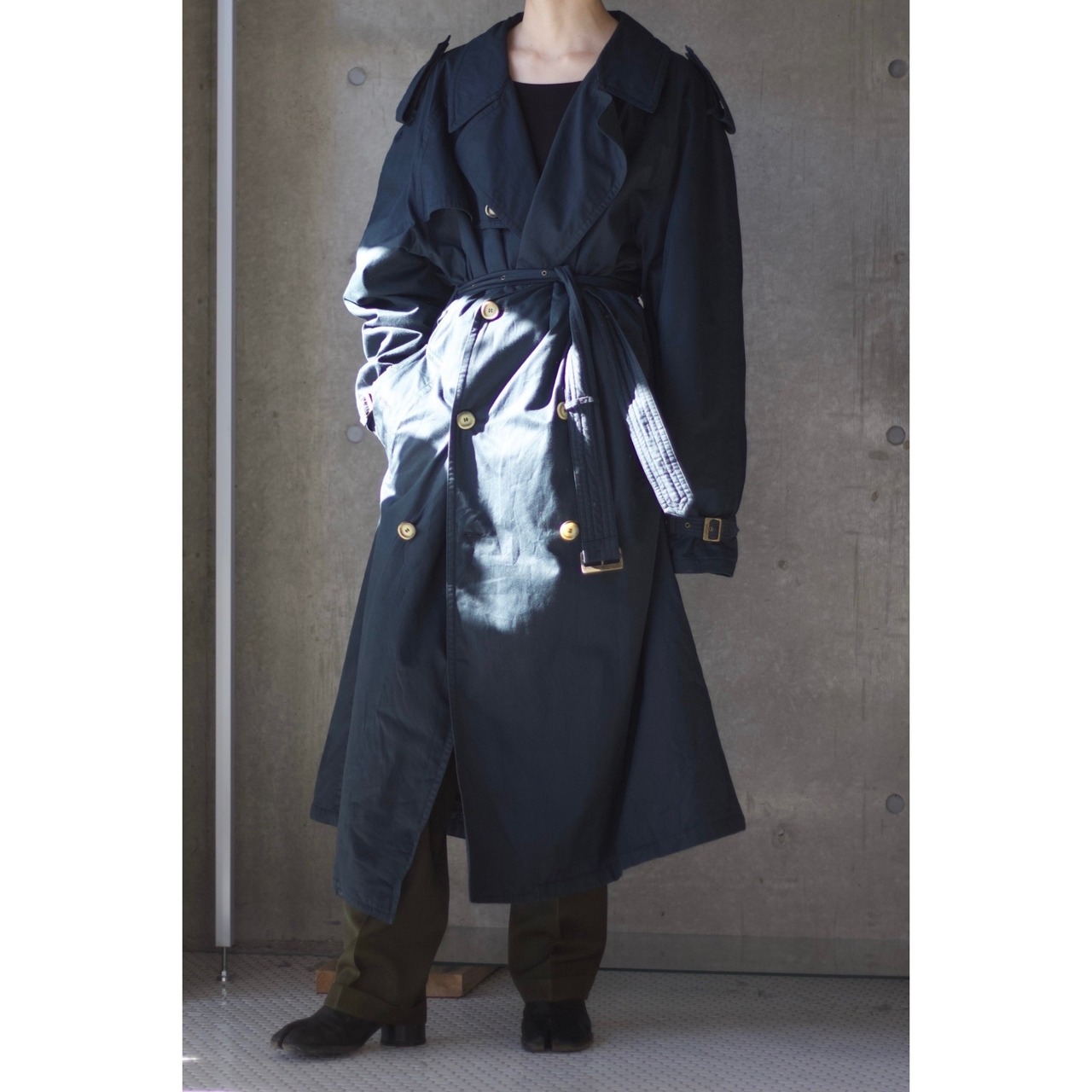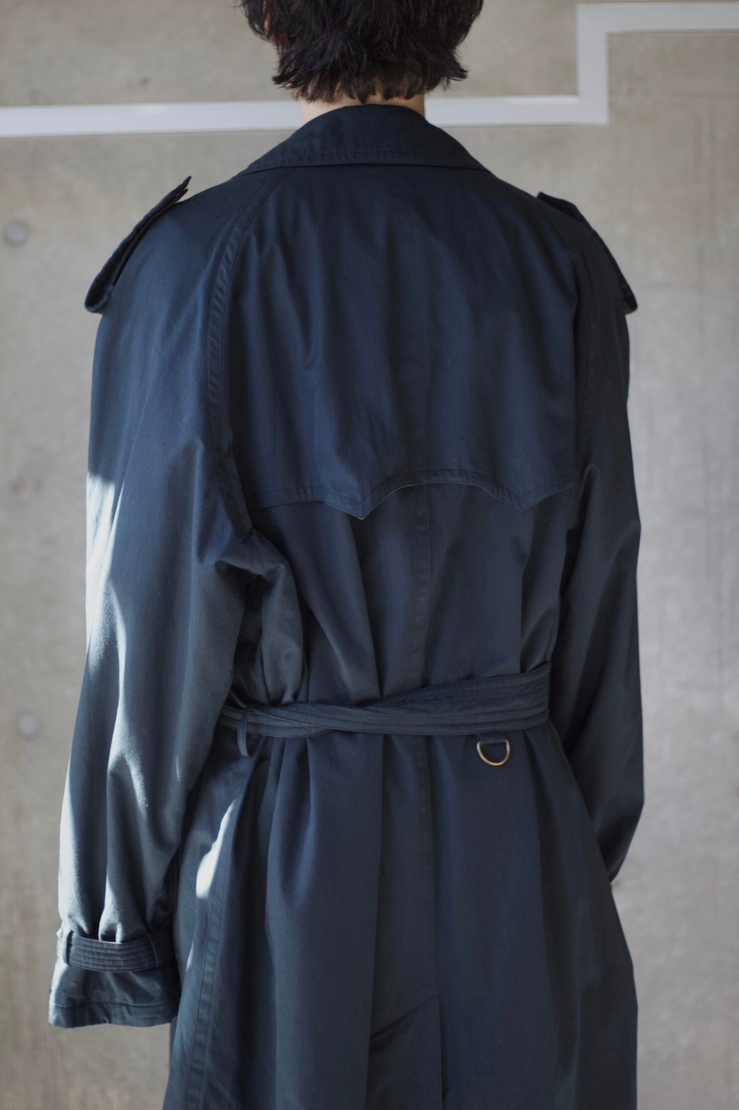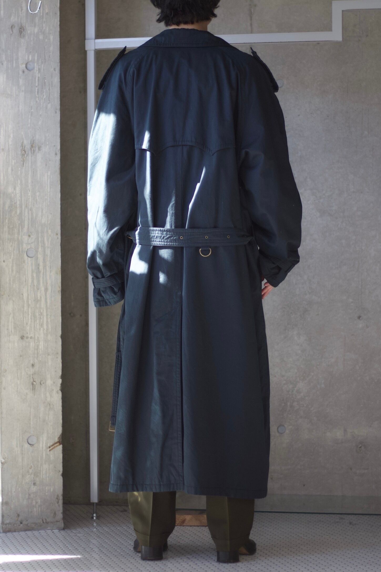 王道でクラシカルなトレンチコートスタイル。エポレッド、ガンフラップやアンブレラヨーク等細かなところのデザインもパーフェクトな仕立ての良さは流石なこのブランド。
