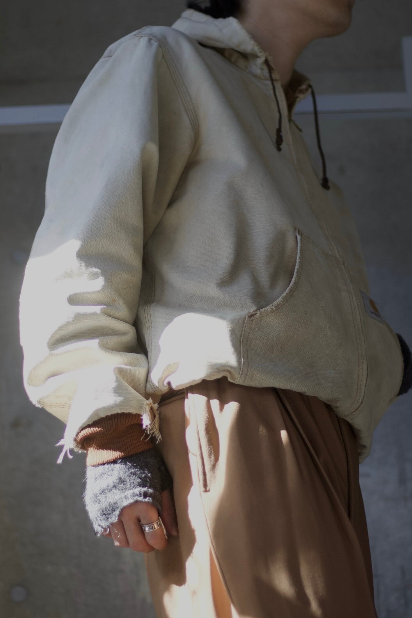 サイズは、XLくらいのサイズでパンツは太めに履いてトップスはタイトなどでAラインのシルエットにしてスタイリング組んでみてもかっこいいです。