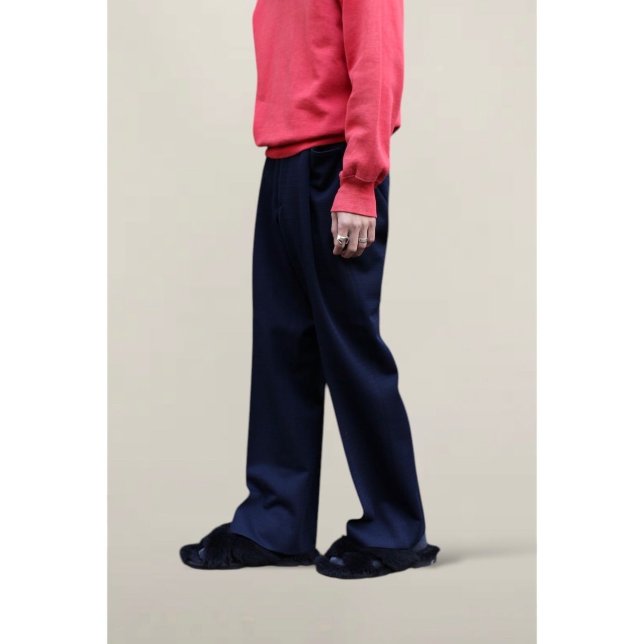 ノータックですっきりとした腰回りに裾までの広いフレアシルエットがカッコ良いです。。