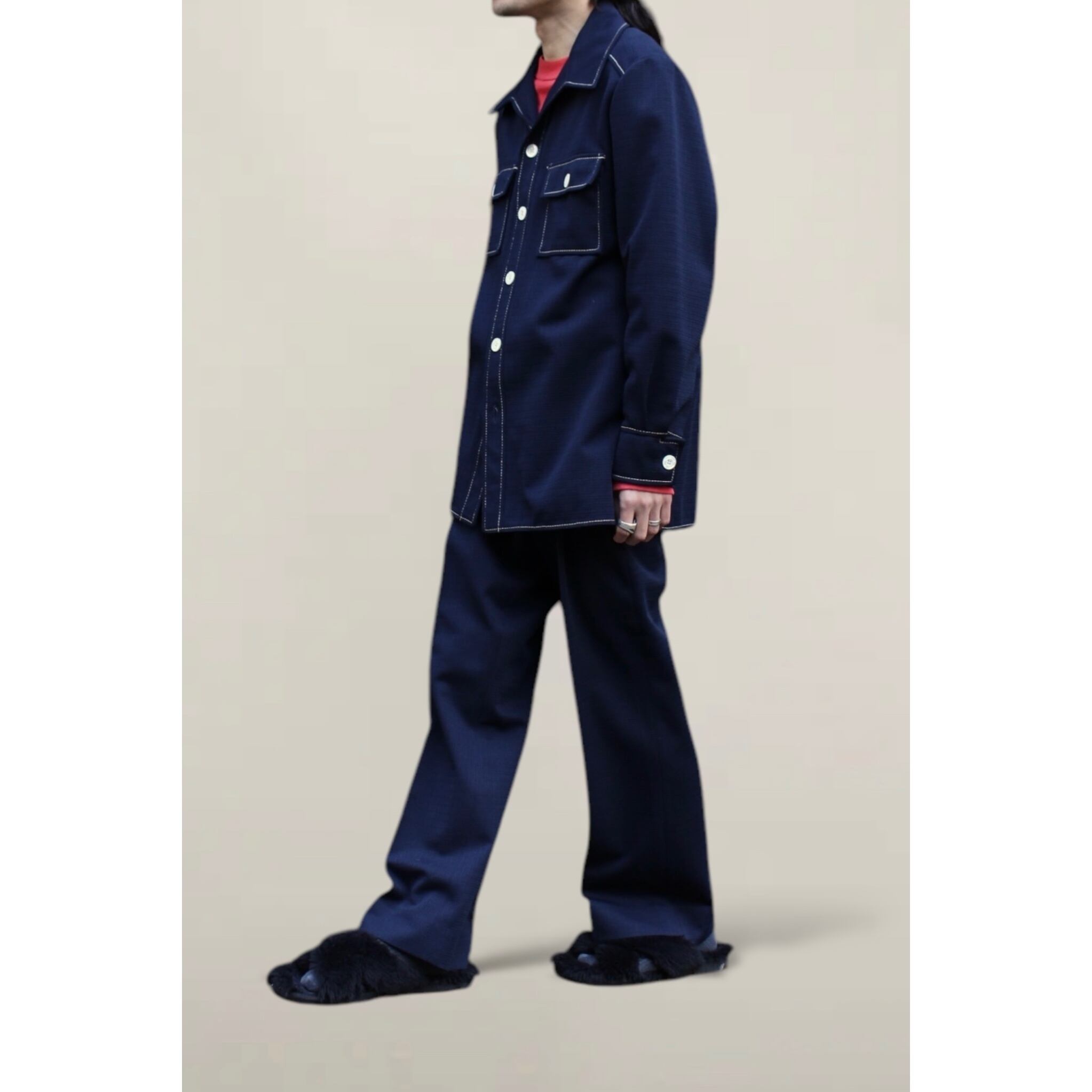 シャツは織柄が施されたポリ生地。シャツとしてもジャケットとしても着用可能なトップス。