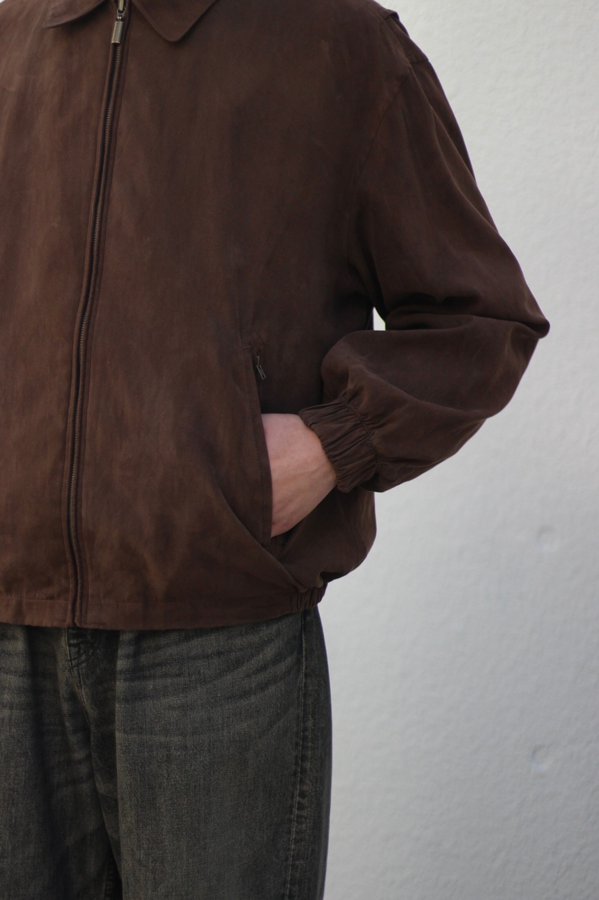 スムース生地とはいいつつもピーチスキンのような多少の雨なら弾いてくれそうなフェイクスエードのような生地で古着には見えない逸品。