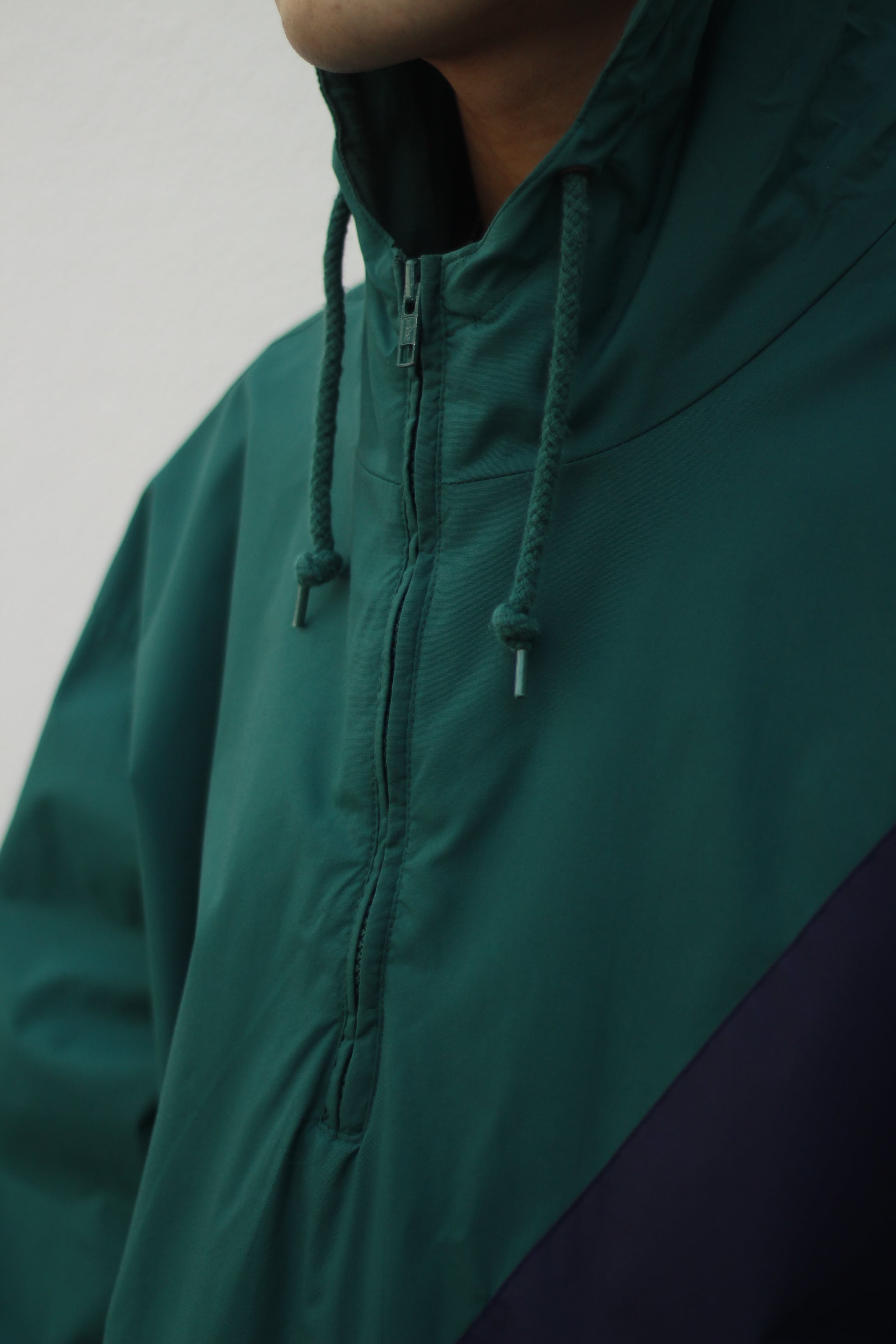 幅広い季節で着用できる軽やかで薄手なナイロン素材でフロントハーフジップでガバッと着れるアノラック仕様。