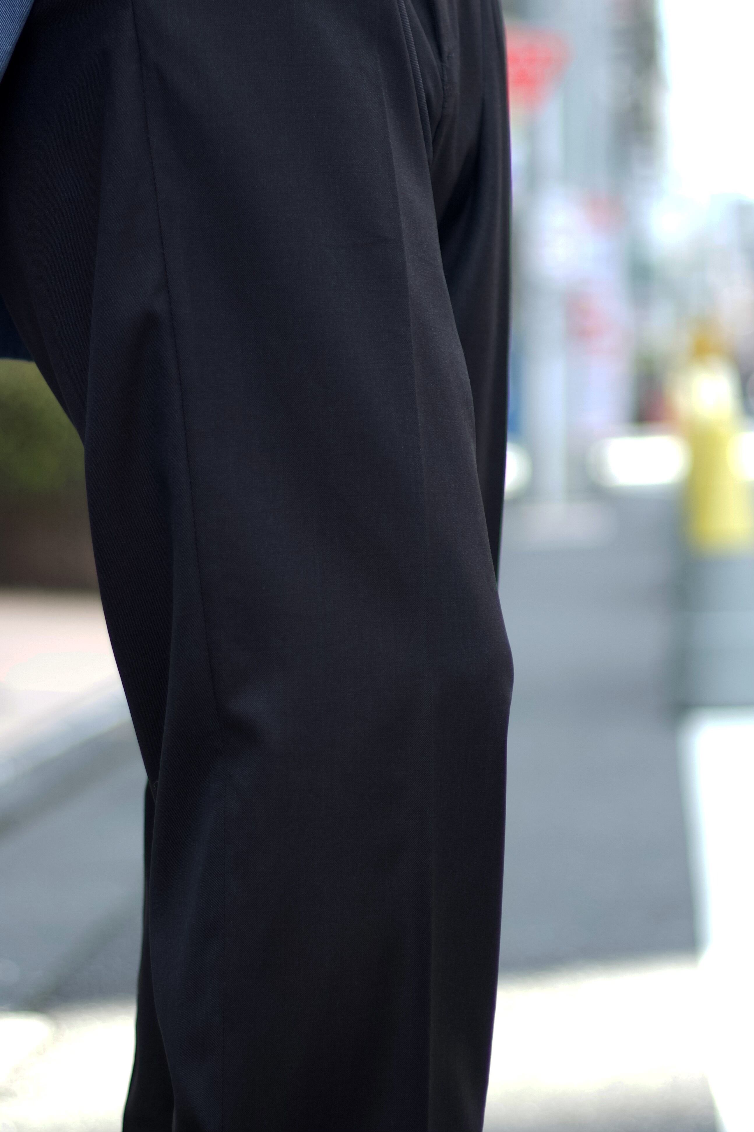 ウールギャバジンならではな起毛はせず、ハリがありながらもコシのあるトロミ生地を楽しんで頂けるファブリック。光沢もあり高級感漂う生地。