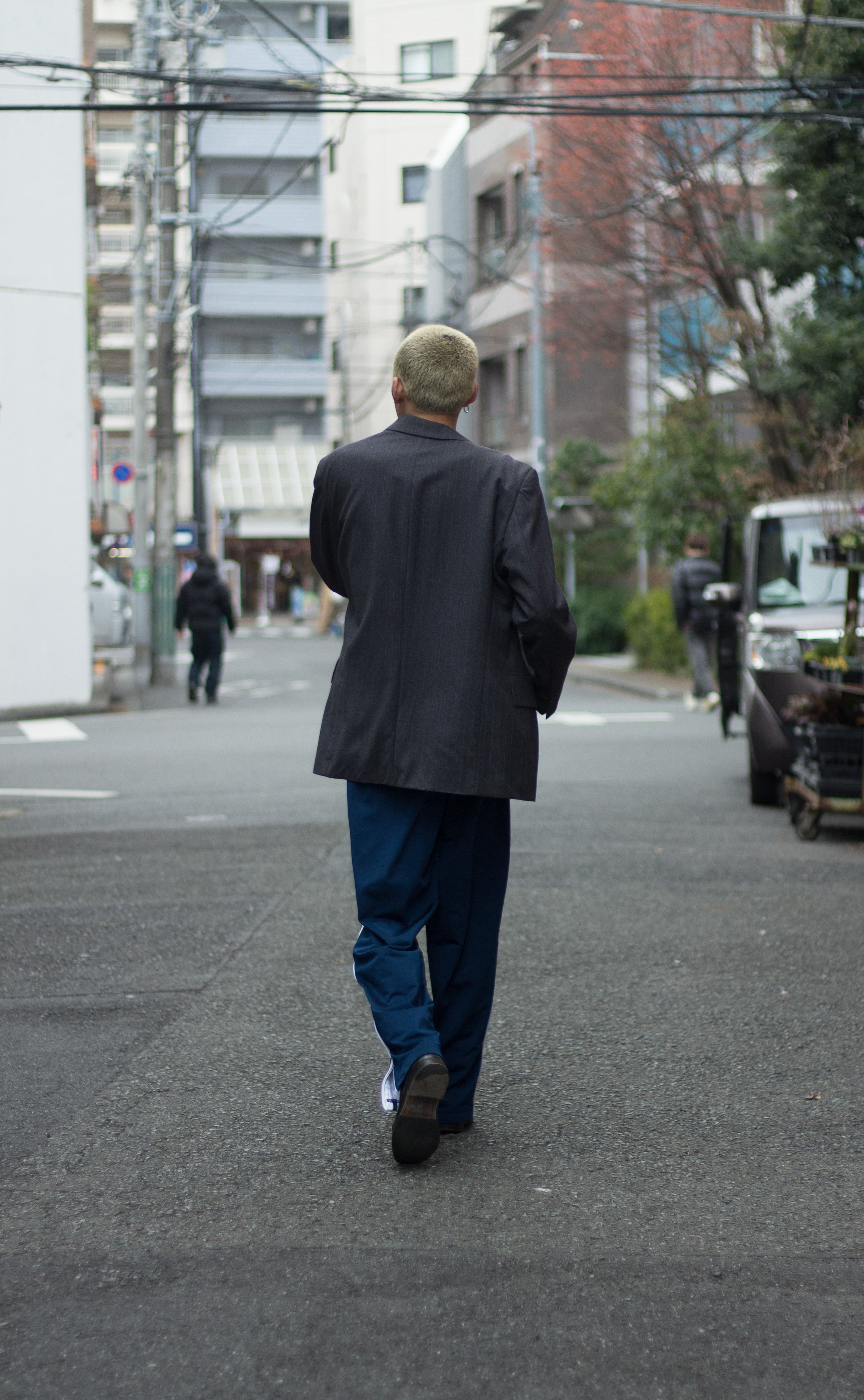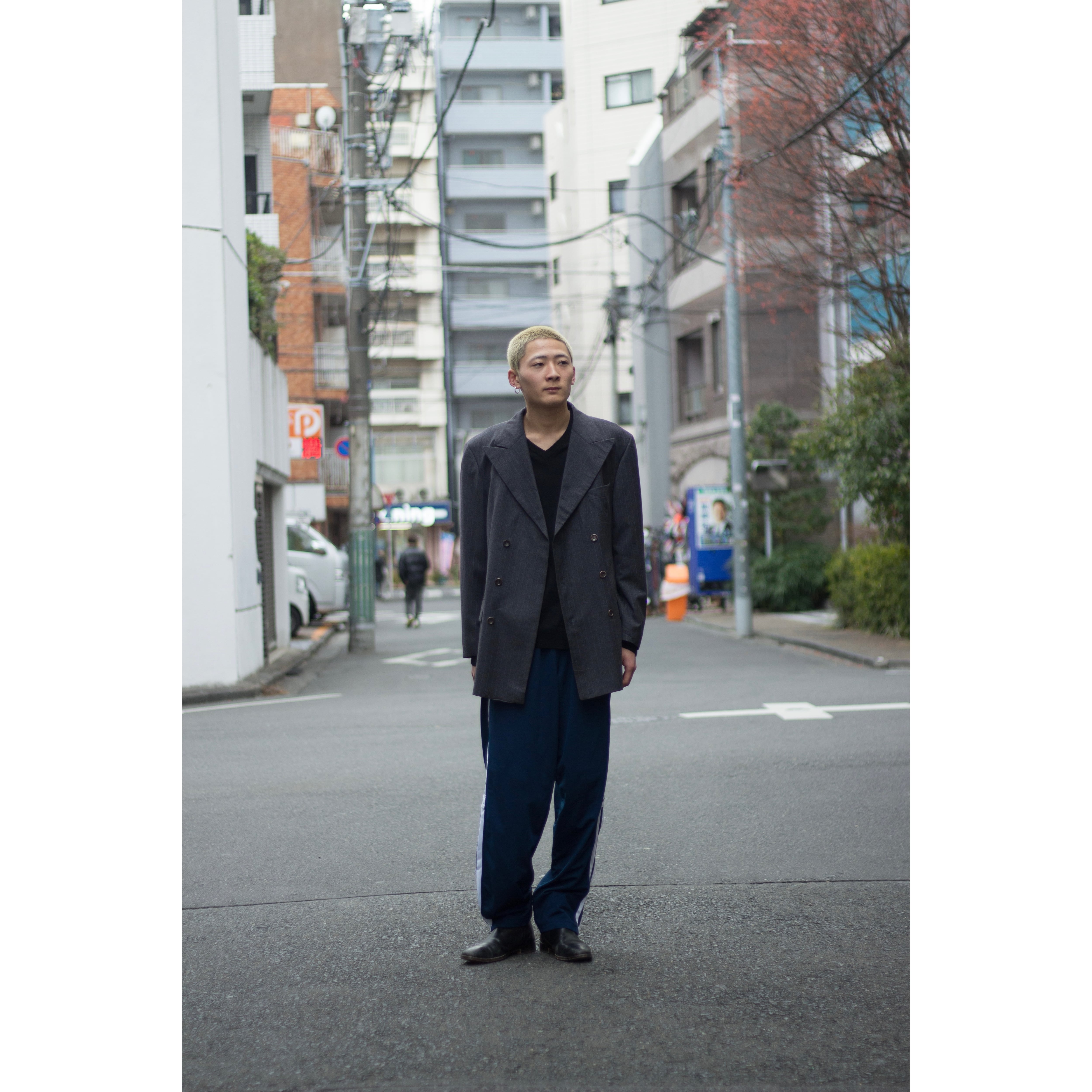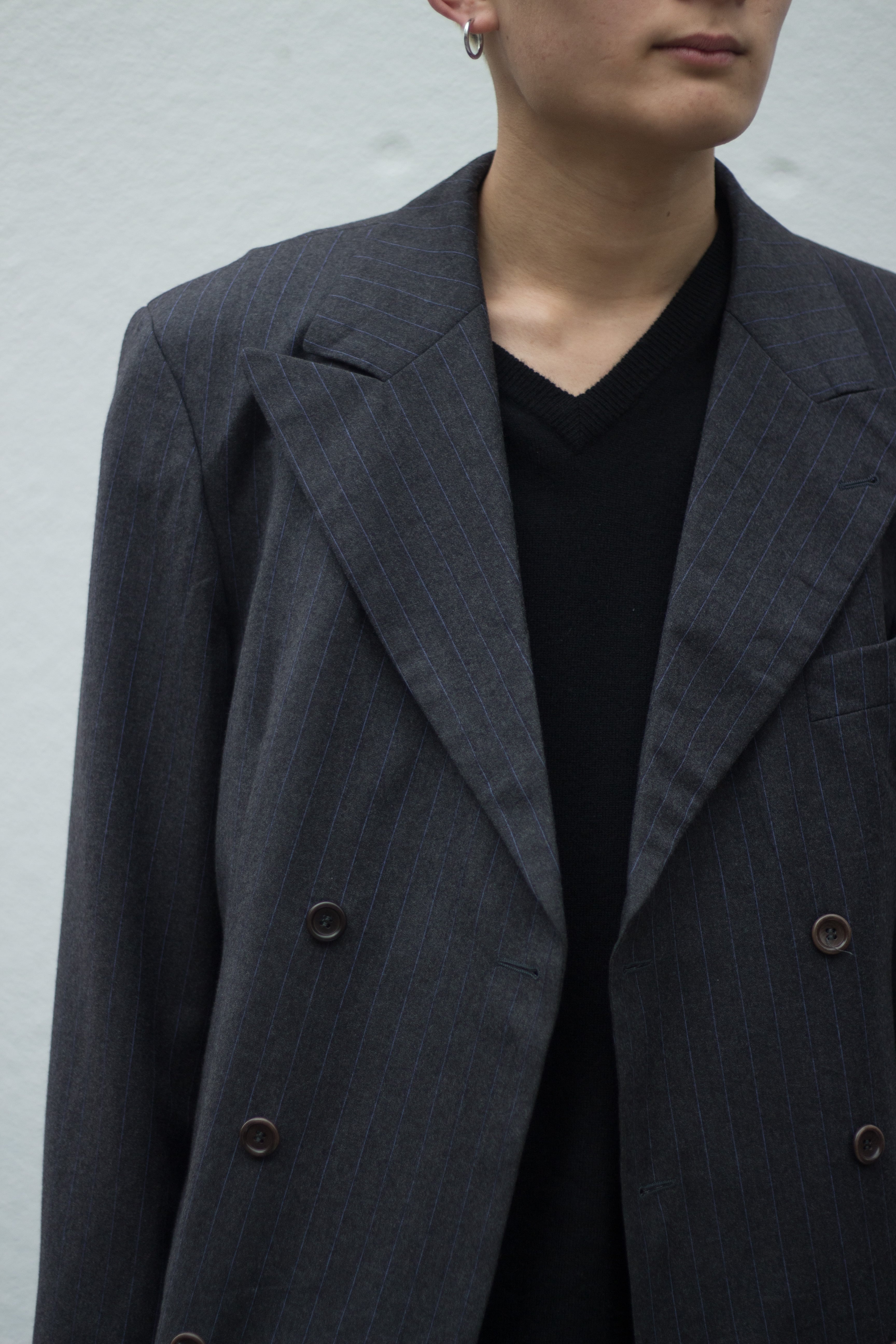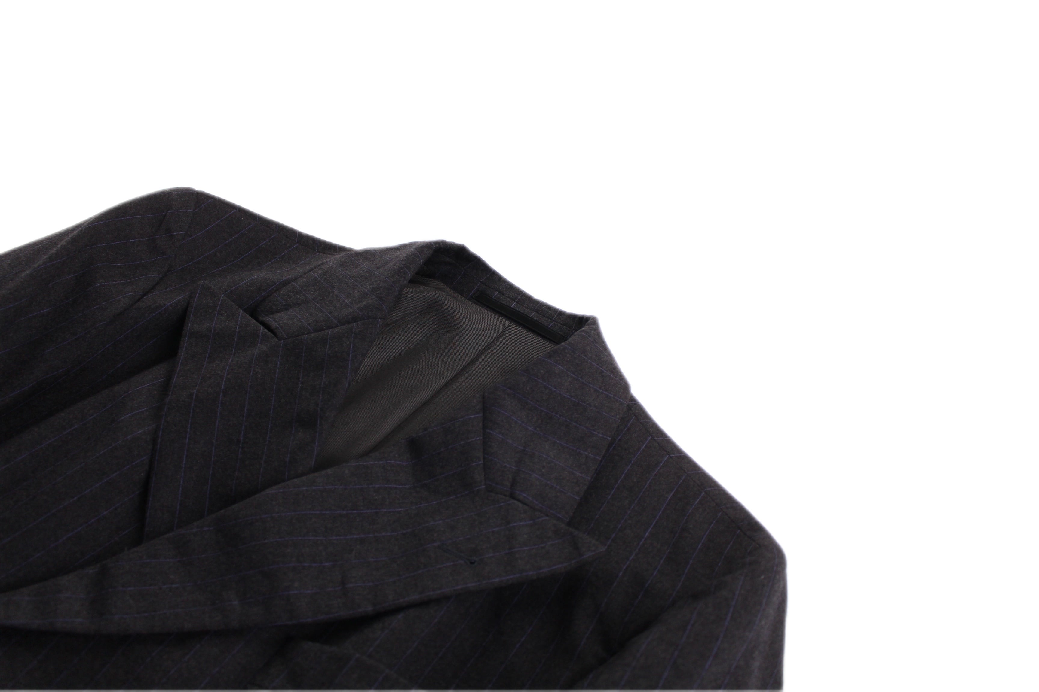 チャコールに薄くパープルのストライプが入りテーラードながらもドレス味は少なくカジュアルに昇華できる1着。