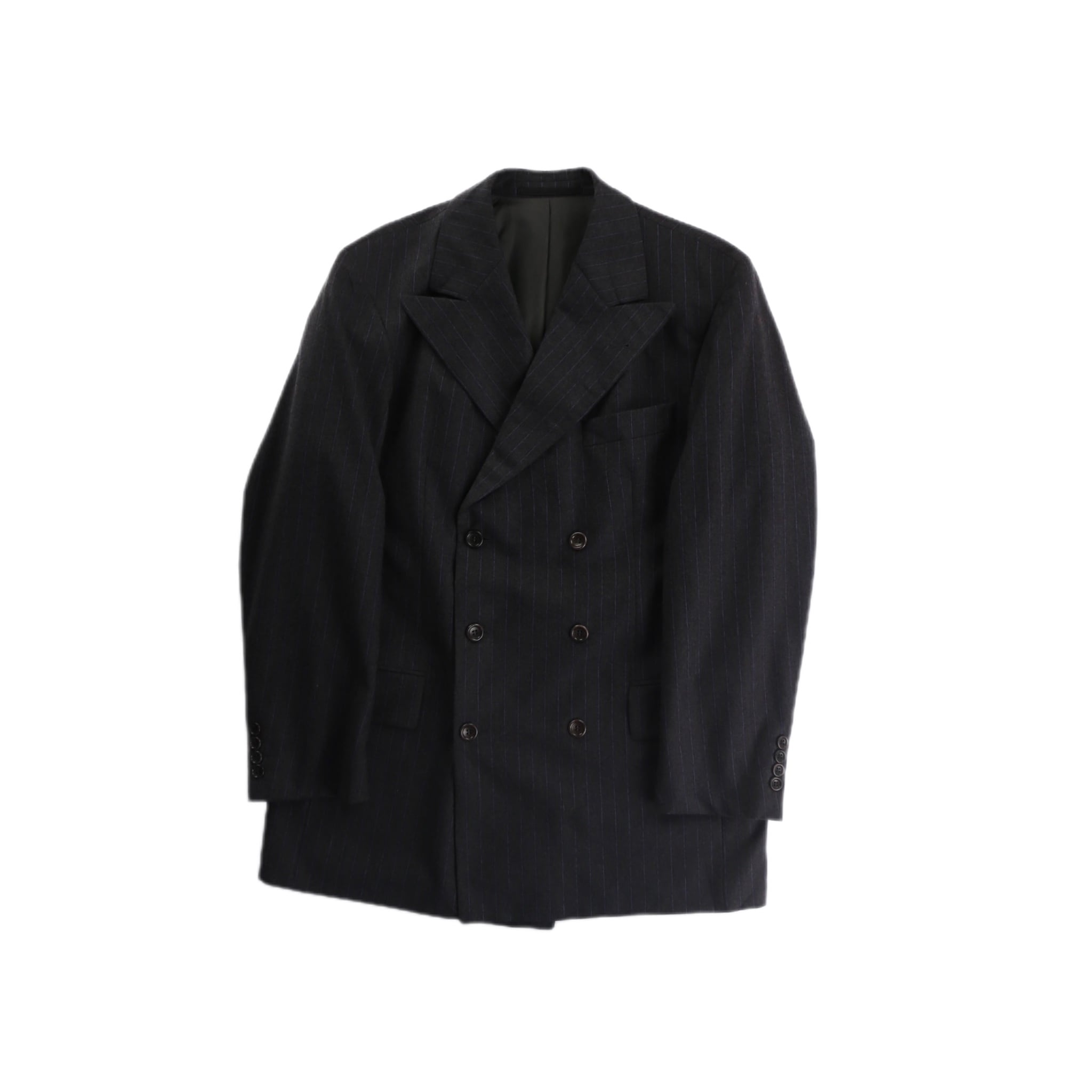 珍しいフロント3つボタンのダブル仕立て。3つボタンなことによってラペル部分は通常よりも少なめに取られてますが、しっかり存在感のあるピークドラペルがブランドらしい☺︎