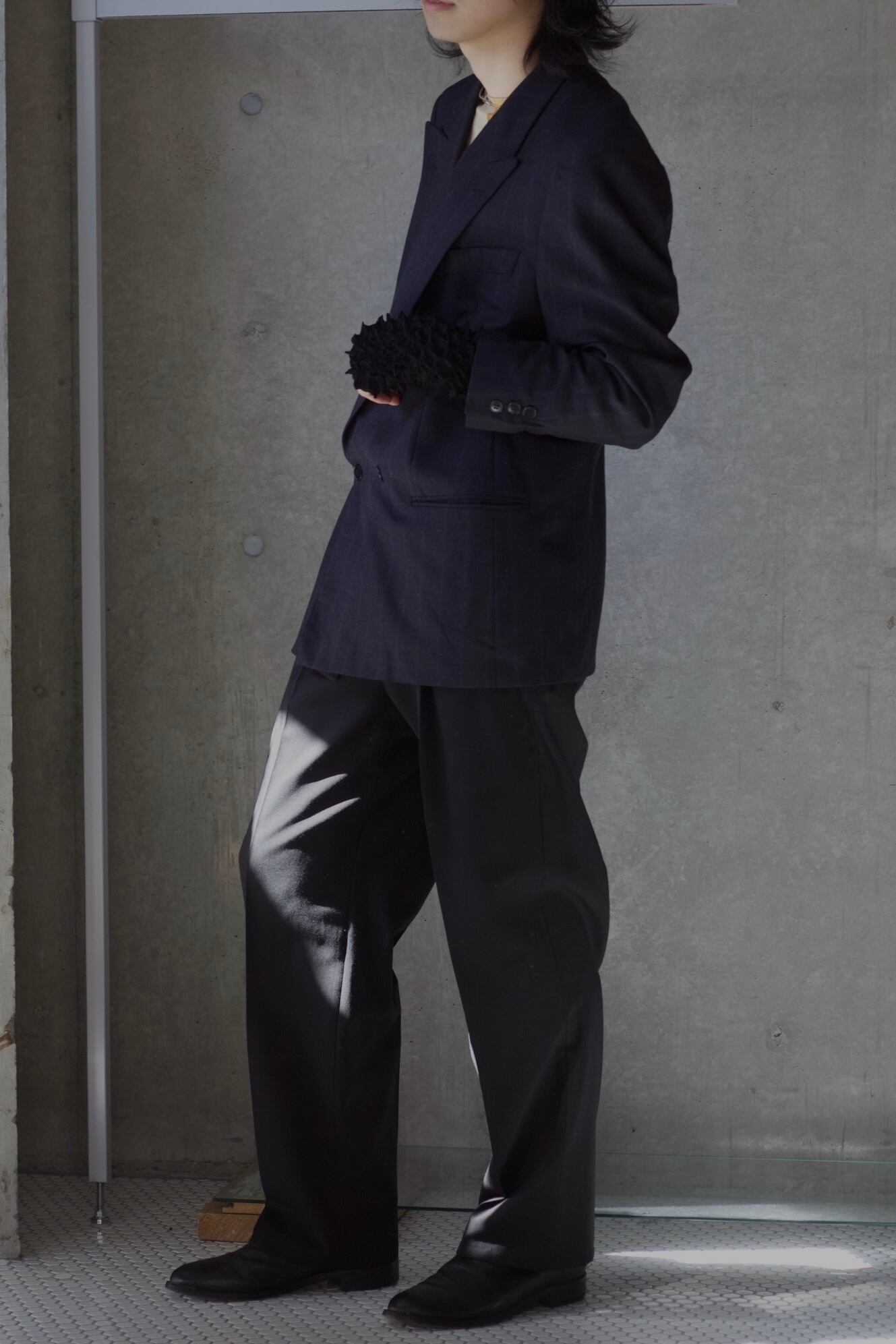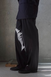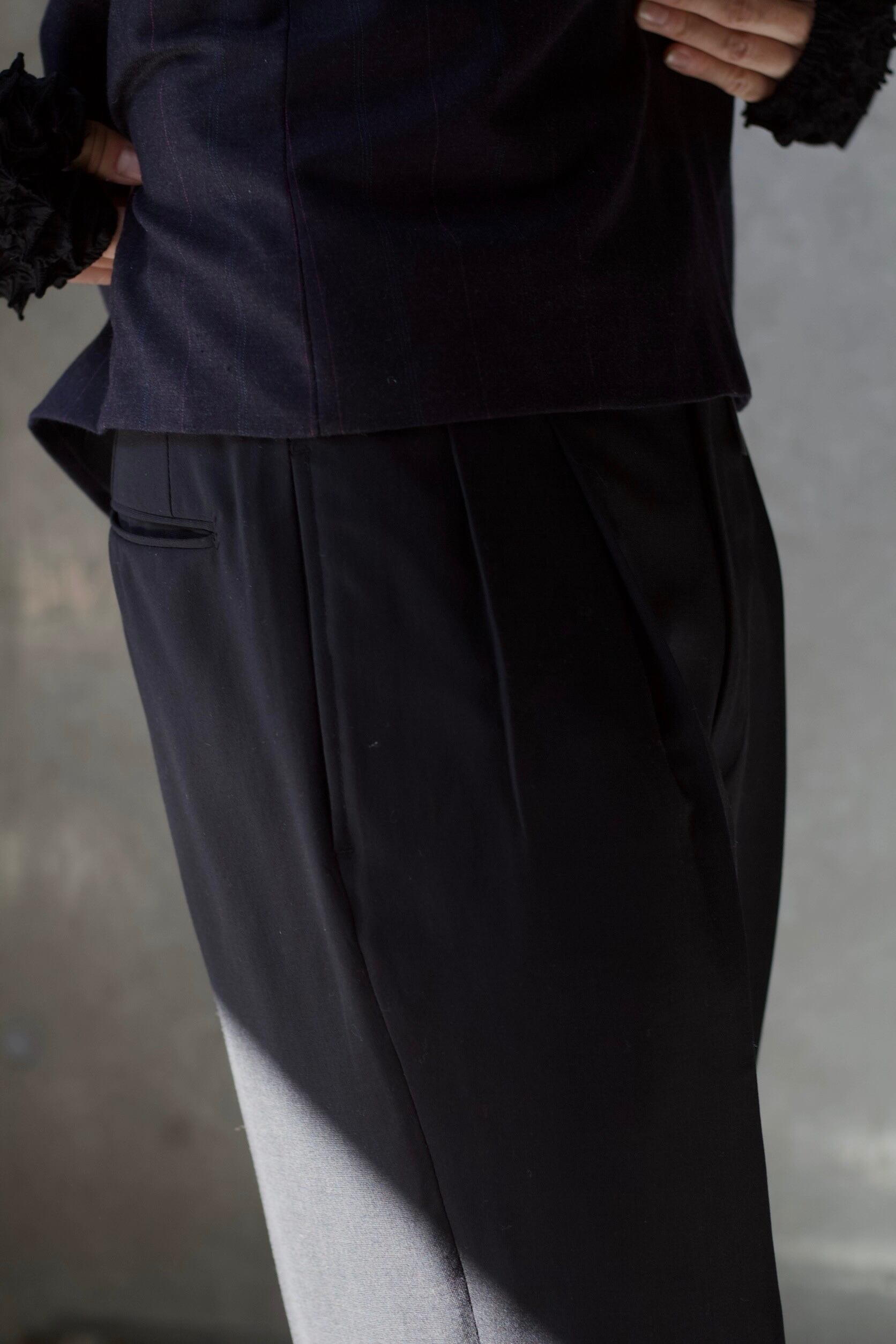 テーパードのスラックスが多い中、テーパードがほんの少し掛かるストンっと落ちるワイドシルエットでシックなブラックカラーリング。