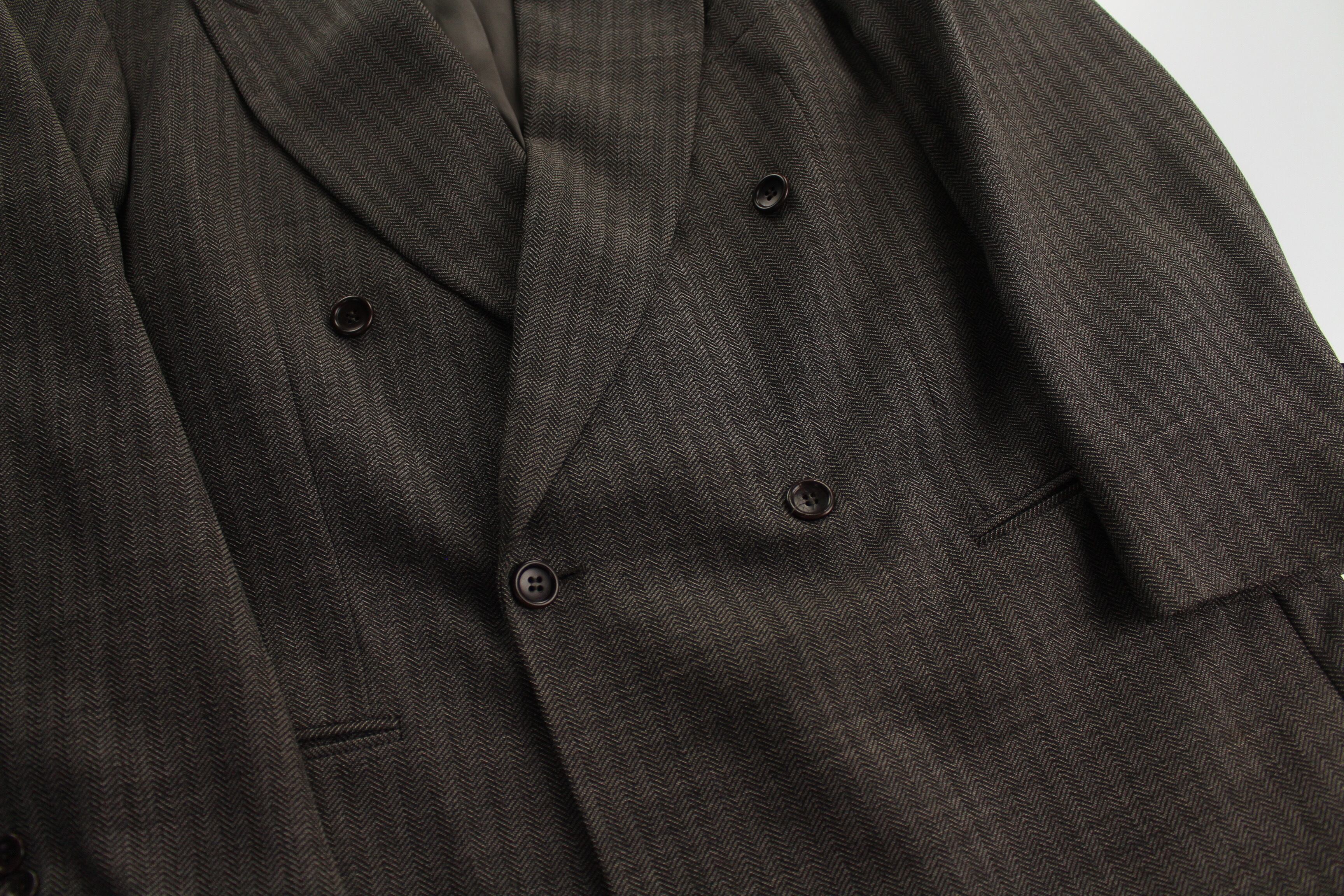 色味が大人っぽくて良い。クラシックなダークブラウンカラーにベージュの織柄が効いています。高級感のあるダブルのテーラードですね☺︎