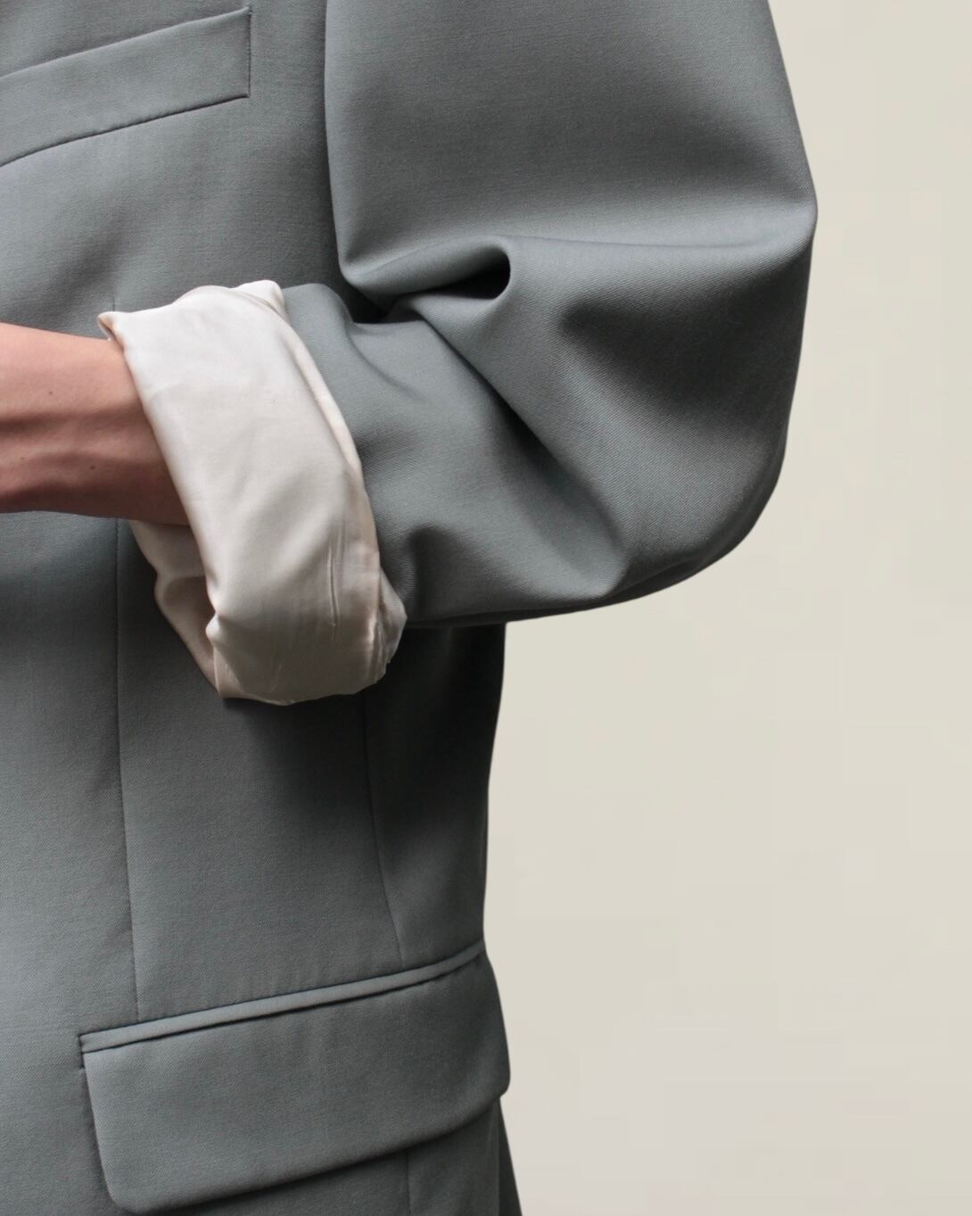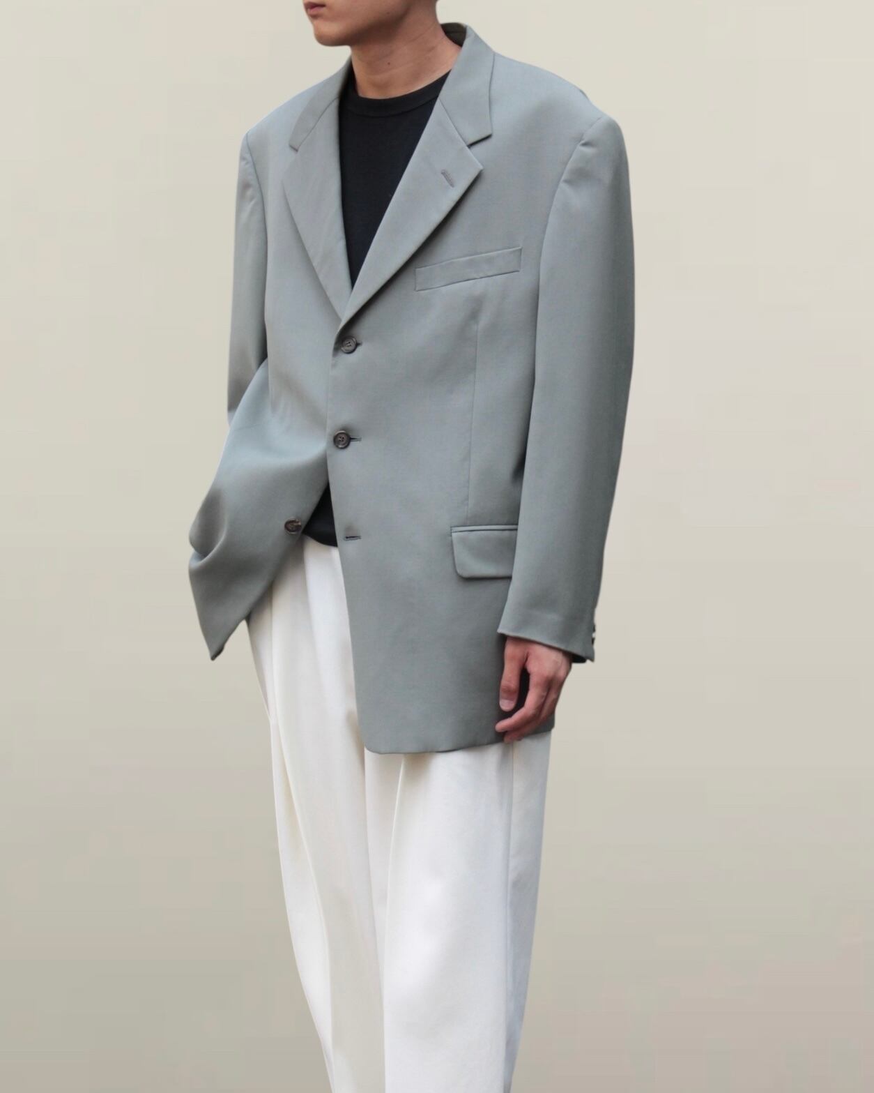 シングル2ボタン仕様で身幅はほんのりシェイプされスタイルをより良く見せてくれる仕立ての良さ。