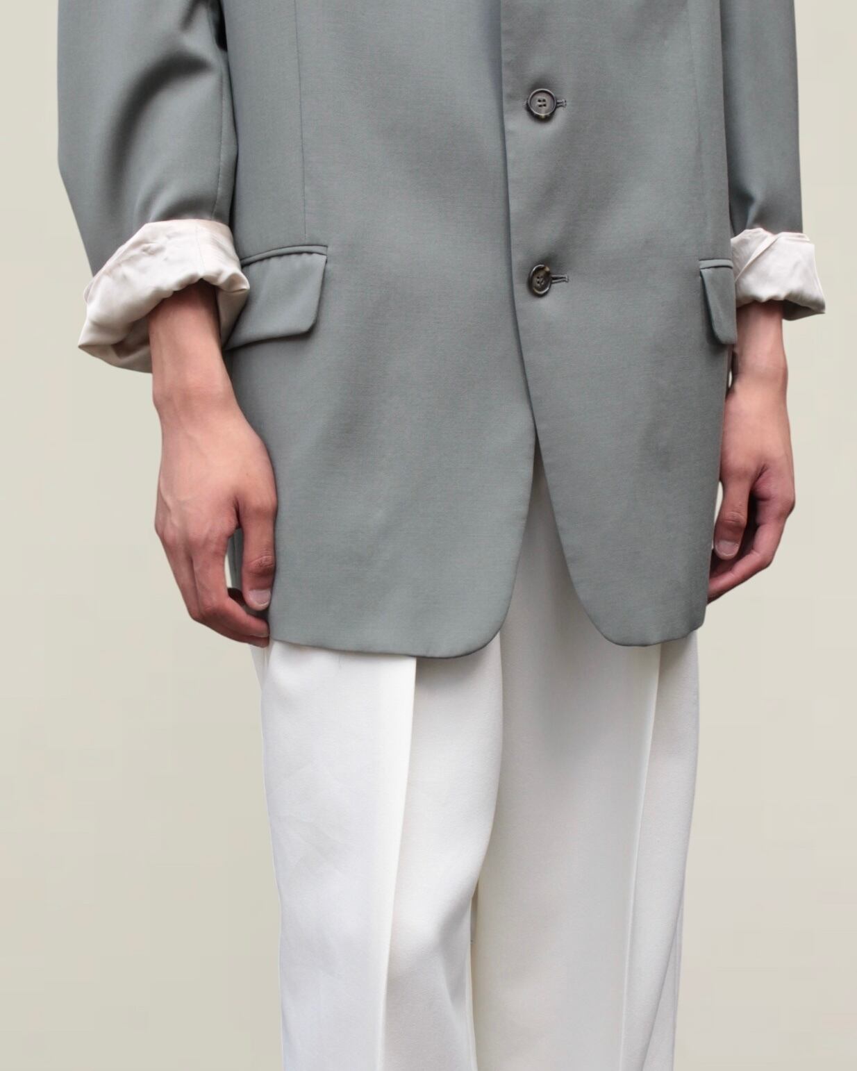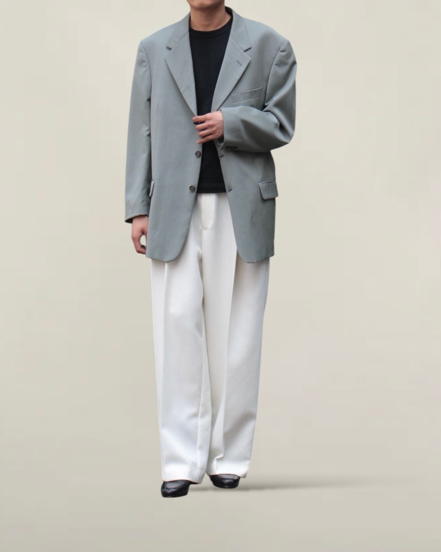 珍しいスモークピスタチオカラー。色物の中でもかなりコーディネートに落とし込みやすいグッドカラー。